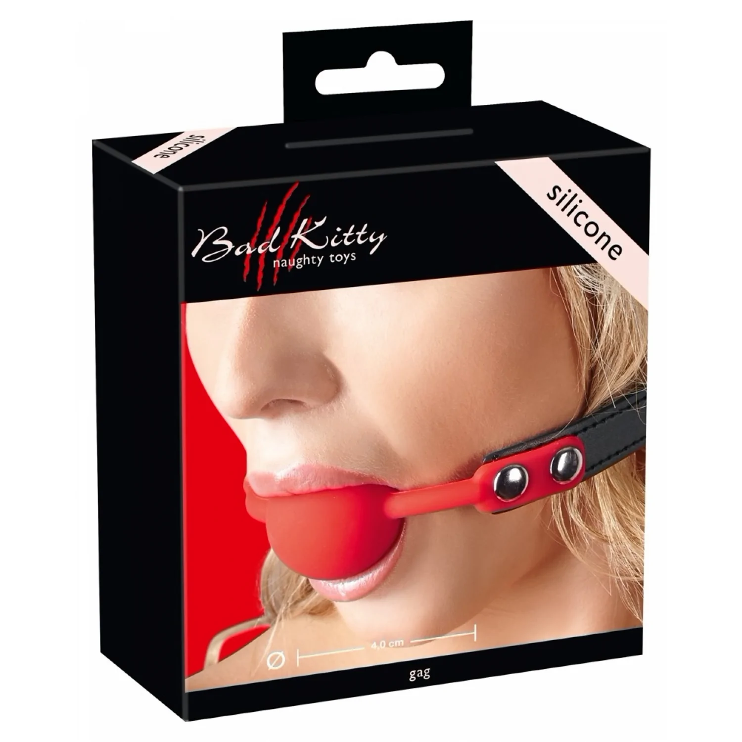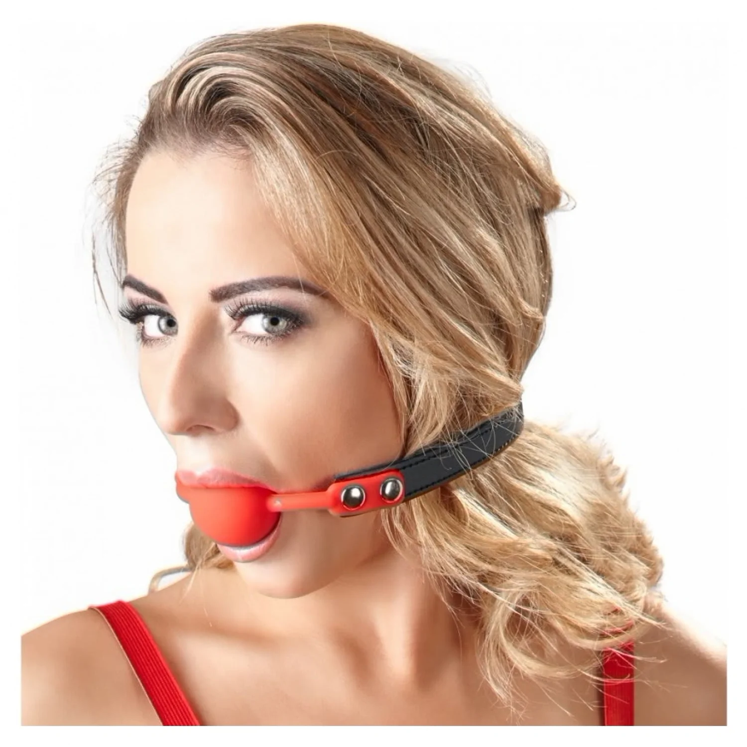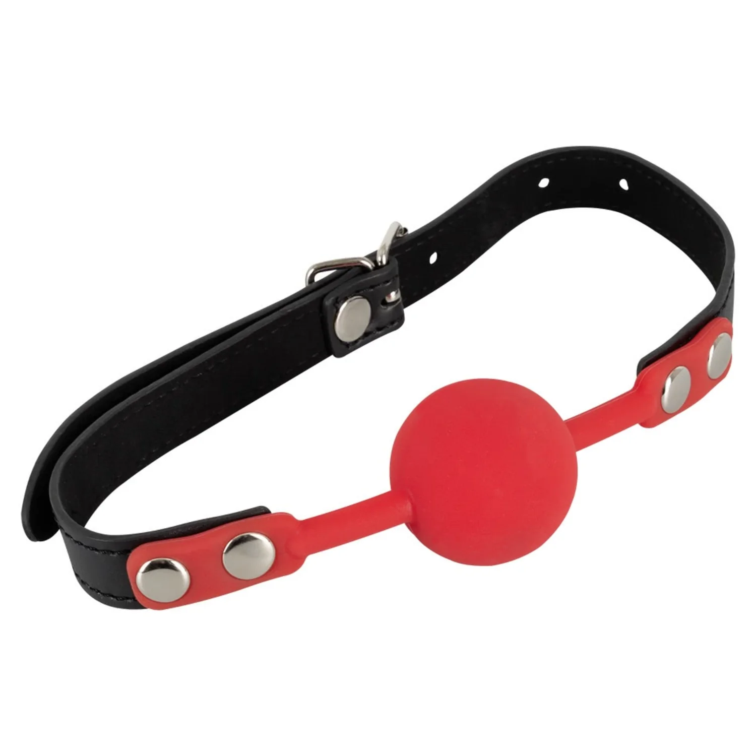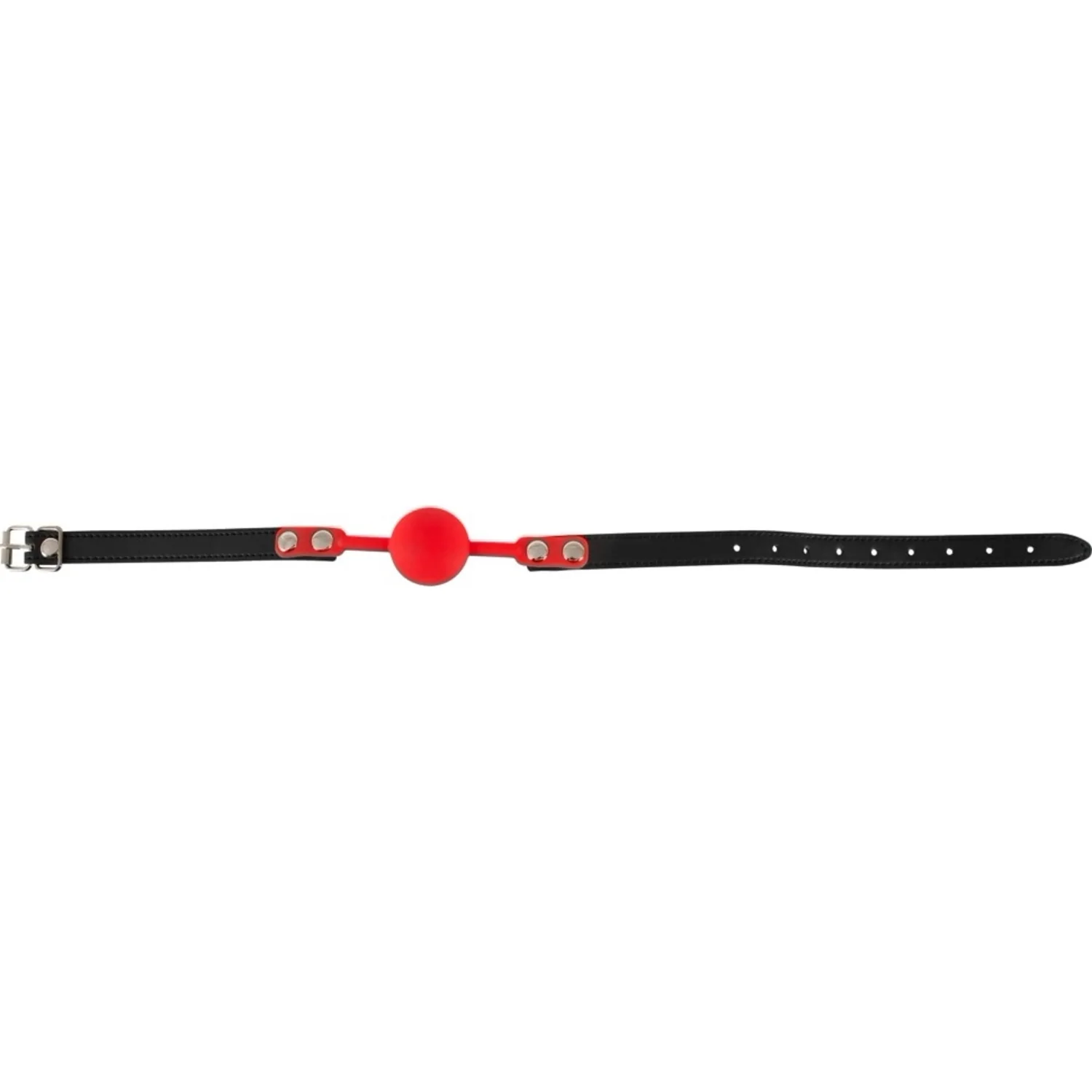 Căluș din silicon roșu atașat unei cingătoare din imitație de epidermă neagră reglabilă, cu patru orificii și o cataramă.