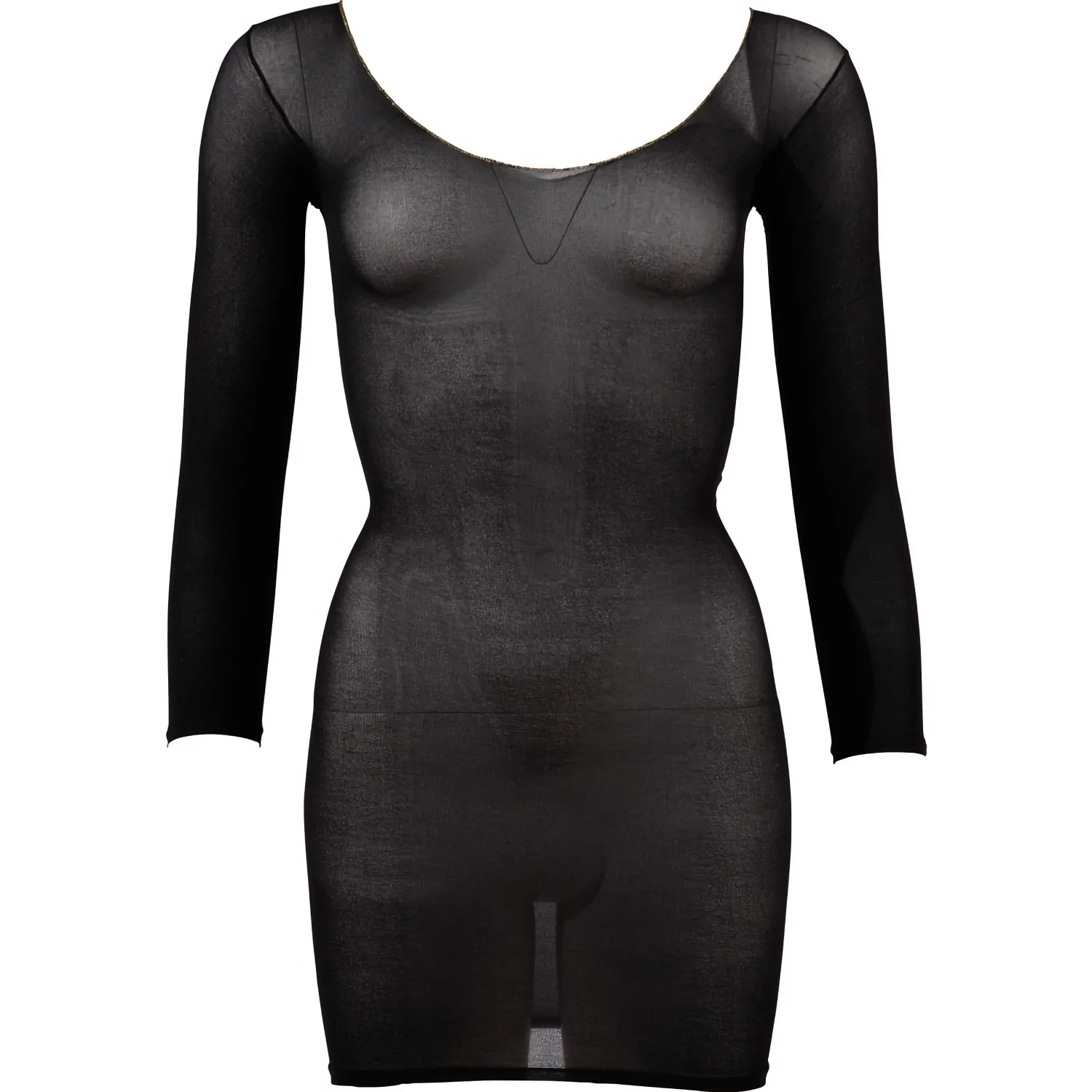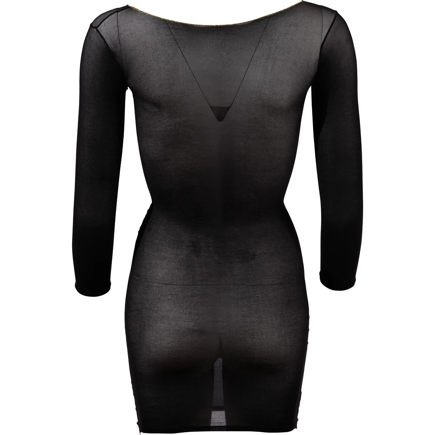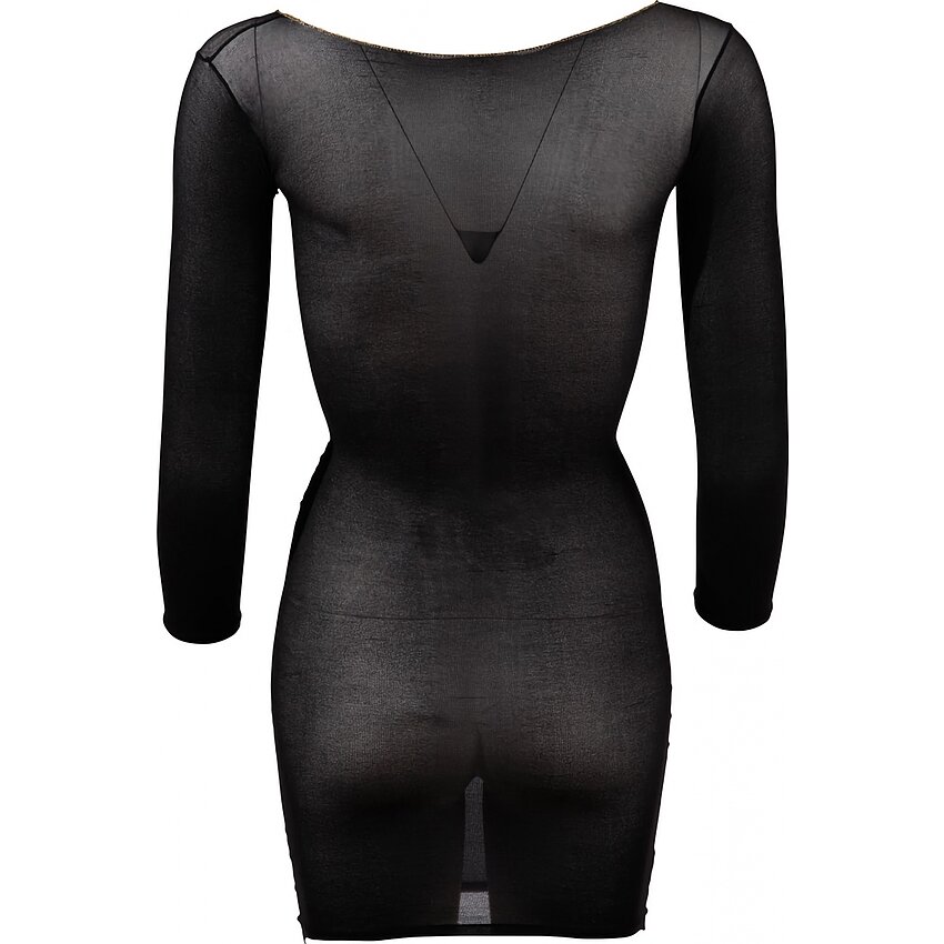- Rochie mini transparentă cu mâneci lungi. - Decolteu adânc atât în față, cât și în spate, accentuat de o cusătură de culoare aurie. - Material elastic care se mulează pe corp. Articolul este realizat dintr-o țesătura elastică.