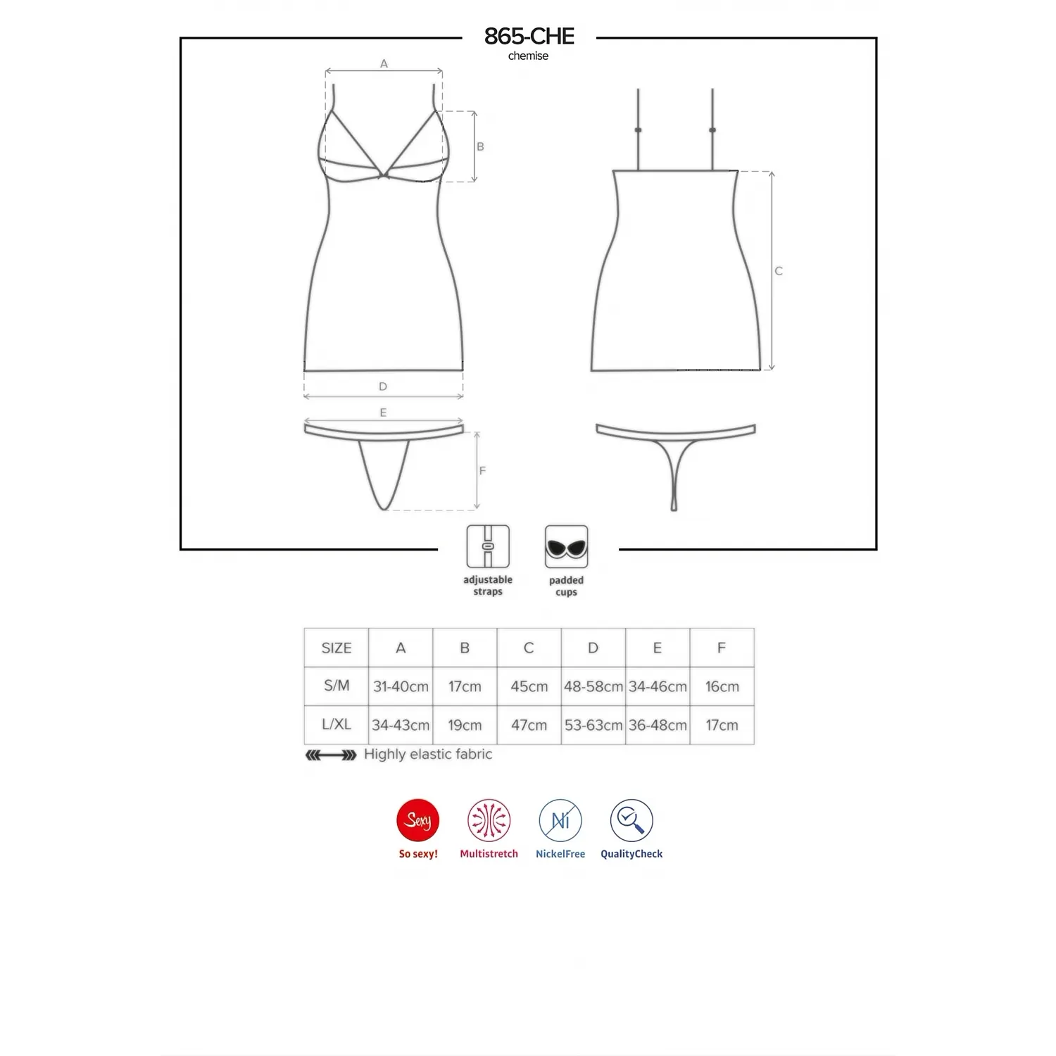 - Chemise-ul are un design sexual care scoate în evidență formele incitante ale trunchiului și ascunde părțile care nu avantajează. - Bretelele sunt ajustabile, punând la dispoziție un control perfect asupra potrivirii. - Cupele sunt deschise și decorate cu dantelă unică, dând un design absolut uimitor. - Cupele sunt căptușite pentru a sublinia fantastic sânii. - Se află o fundiță mică și o bijuterie strălucitoare în zona bustului, detalii fermecătoare. Desuu Obsessive 865-CHE închis la culoare este lucrat dintr-un material cu elasticitate.