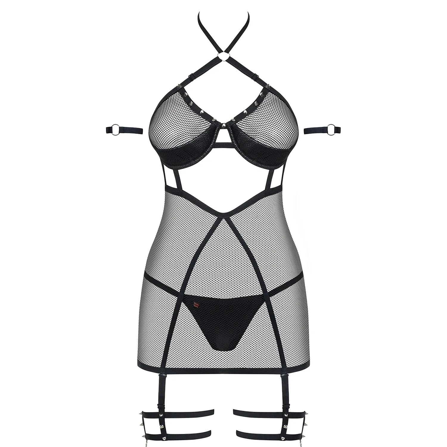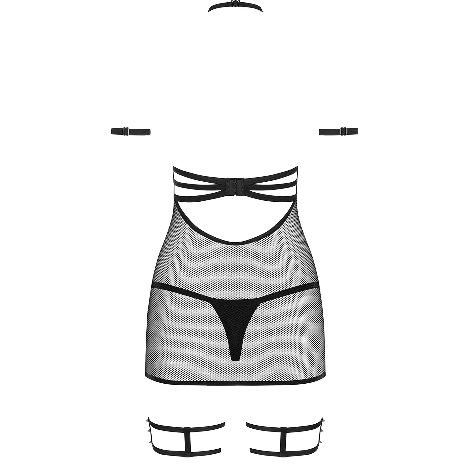 O ținută incendiară ce va stimulă pasiuni nebănuite partenerului tău. Rochița este făcut dintr-un material tip plasă cu benzi elastice dispuse în zona bustului, a mâinilor și a picioarelor, lăsând trupul dezgolit, pe alocuri. Benzile sunt ajustabile datorită micilor catarame atașate. Prinderea se face după gât, iar țintele atașate dau un farmec aparte produsului. Cupele sutienului au întăritură și sârme de sprijinire pentru a se potrivii oricărui tip de siluetă. Articolul este lucrat dintr-un material elastic.