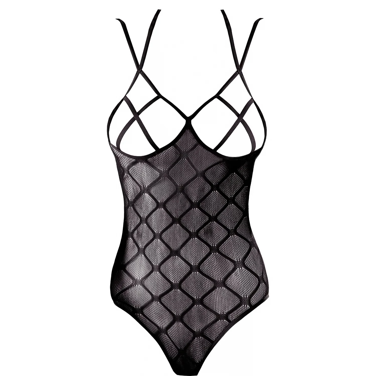 Face inimile bărbaților să bată mai repede! Body negru senzual, cu un decolteu generos, spatele gol și deschizătura în zona inghinală. Body-ul asociază un design drăguț cu dantelă, cu un model de rețea semi-transparentă. Sânii sunt acoperiți doar de câteva bretele transversale. Acest fabricat este lucrat dintr-o țesătura cu elasticitate.