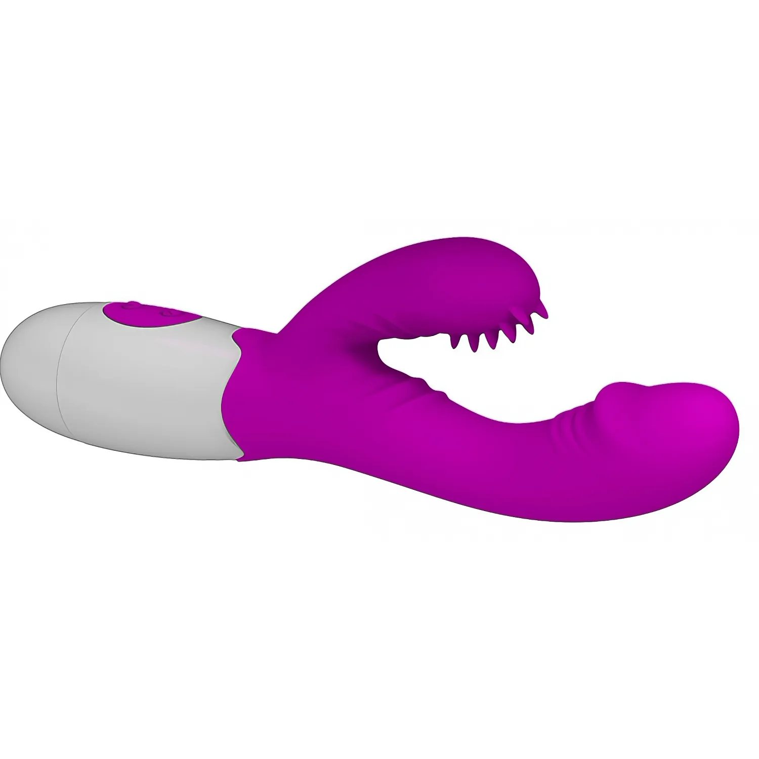 Vibrator cu stimulator clitoridian de mărimi mici, din silicon, material neted și elastic conceput pentru a stimula simultan vaginul, punctul G și clitorisul.