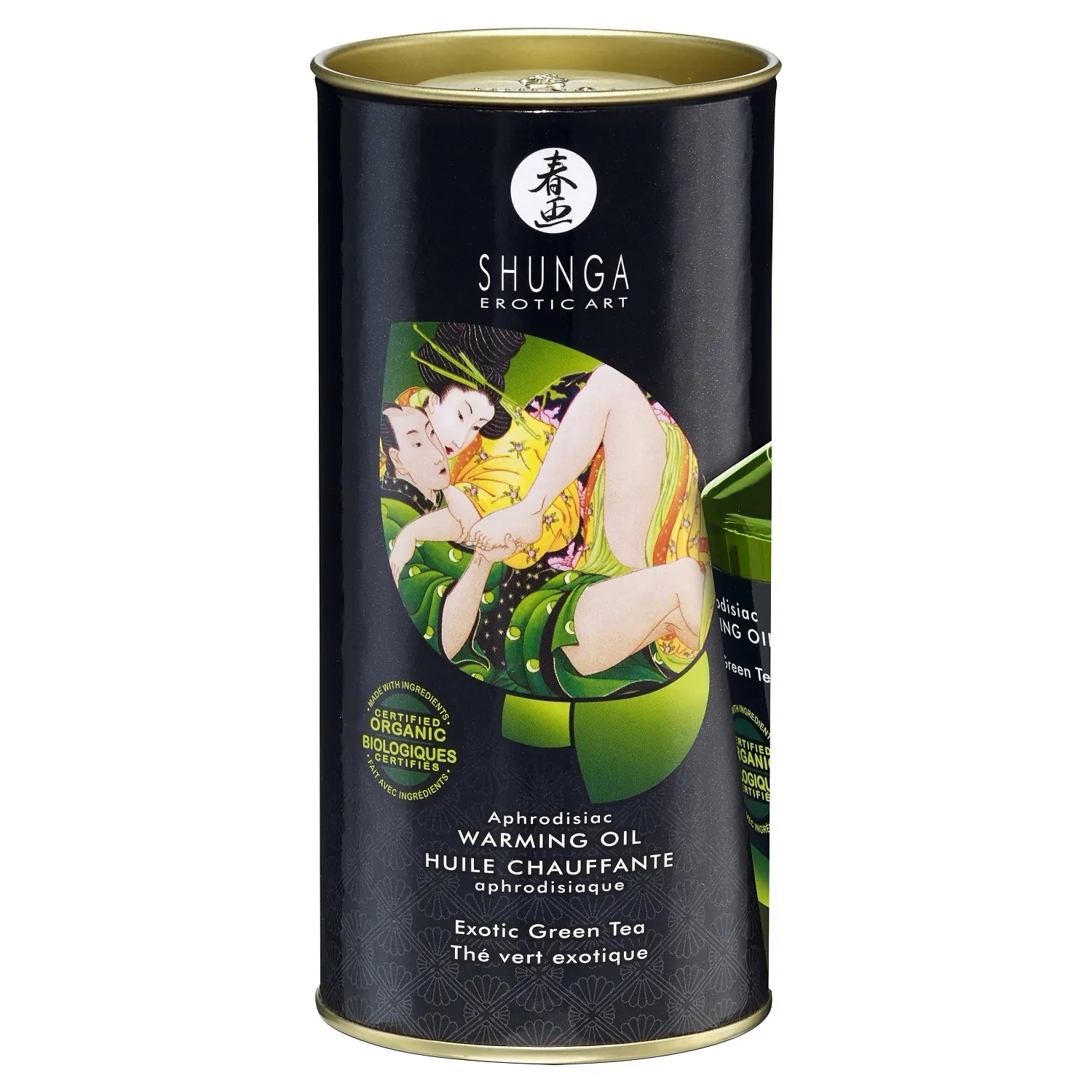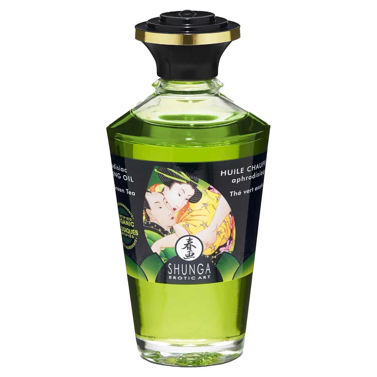 Uleiul Organic Aphrodisiac Warming Oil by Shunga Erotic Art cu aromă exotică de ceai verde poate fi folosit și pentru zonele intime. Uleiul de frecție Shunga făcut 100% din compoziție organice certificate, cu rezultat de încălzire activat de respirație, pentru o destindere profundă și un masaj senzual!