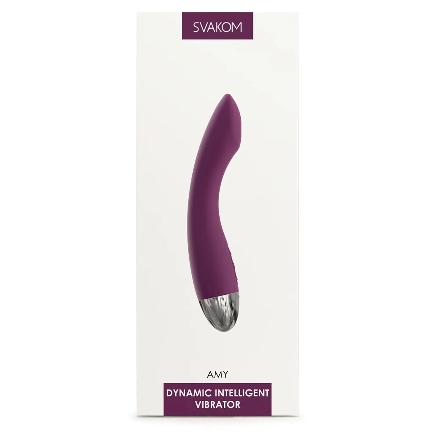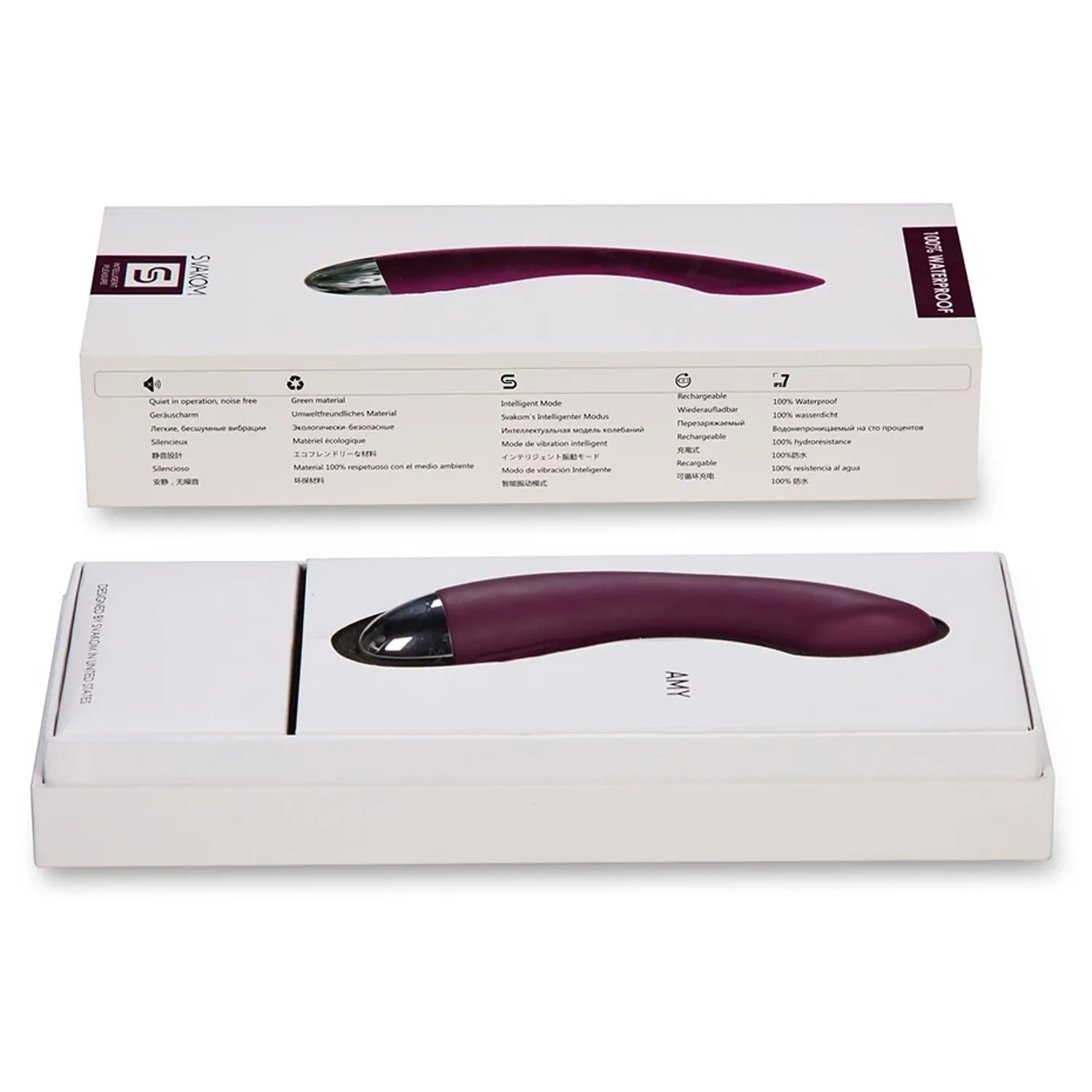 Vibrator Amy de la Svakom, este un vibrator elegant, neted, rezistent la apă și cu 6 chipuri de vibrație și pulsație. Datorită formei sale poate stimula cu ușurință punctul G. Are 5 maniere + 1 mod inteligent Svakom.