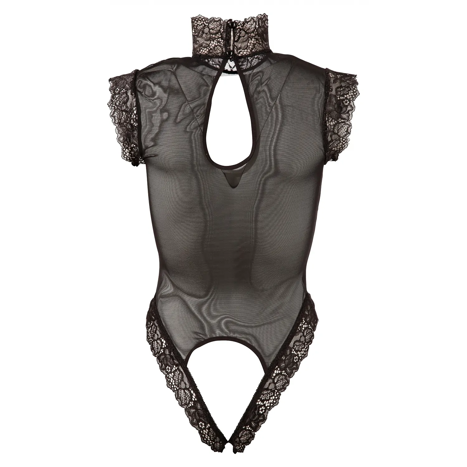 Foarte de atrăgător! Body transparent negru cu garnituri din dantelă pe mâneci, guler (2 butoane în spate) și în jurul picioarelor. Sânii și croșetele sunt decupate și decorate cu lanțuri detașabile.