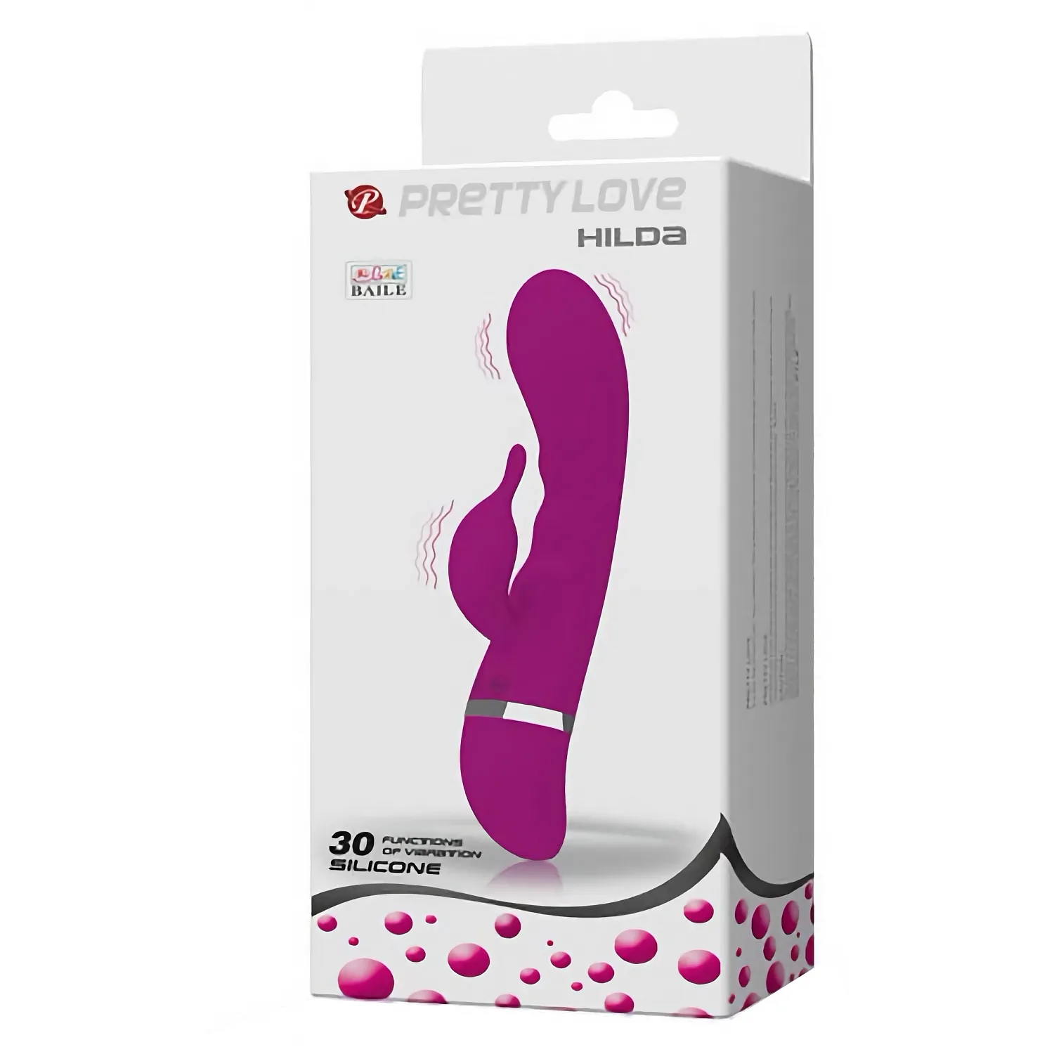 Pretty Love Hilda este un vibrator bunny confectionat din silicon de excepție superioara. Acesta are o lungime de 18.5 cm si un calibru de 3.4 cm, fiind desăvârșit pentru a fi folosit de oricine, chiar si pentru cei care nu au mai întrebuințat un vibrator rabbit niciodata. Are 30 de viteze de vibratie extrem usor de utilizat, prin doar 2 butoane.