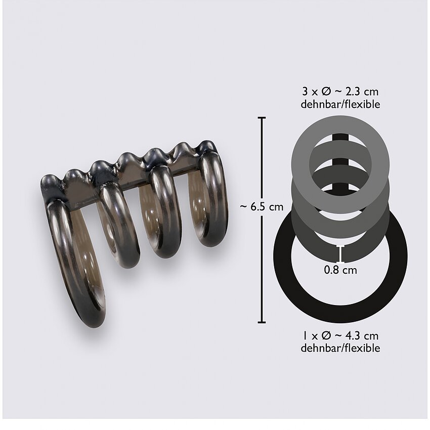 Descoperă puterea erecțiilor impresionante și mai mult! Inelul de penis Bad Kitty Ring Quartett îți oferă 4 inele conectate, pentru senzații stimulante. Grosimea fiecărui inel este de 8 mm. Acționează acum și experimentează plăcerea intensificată și erecții puternice cu acest inel penis inovator!