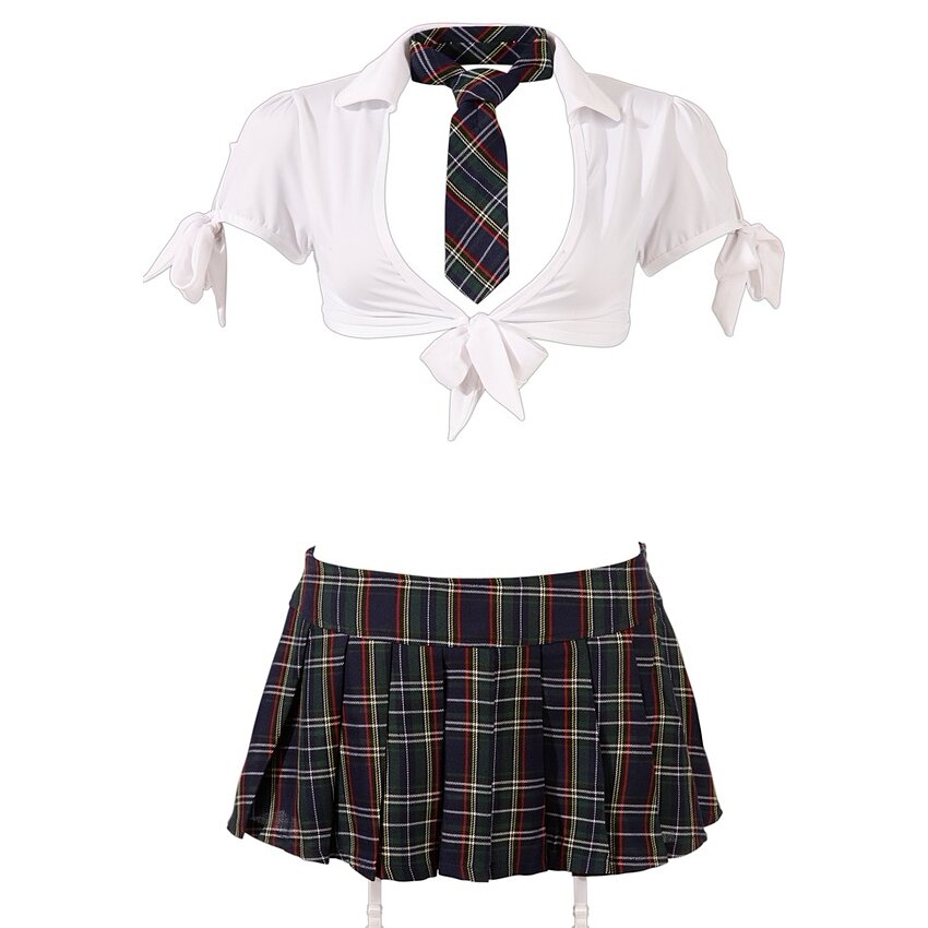 Aproape ca un popstar! Fustă cu cravată, top scurt pe care să-l legați în față și pe brațe și chiloți fără cruci, cu o gaură super.