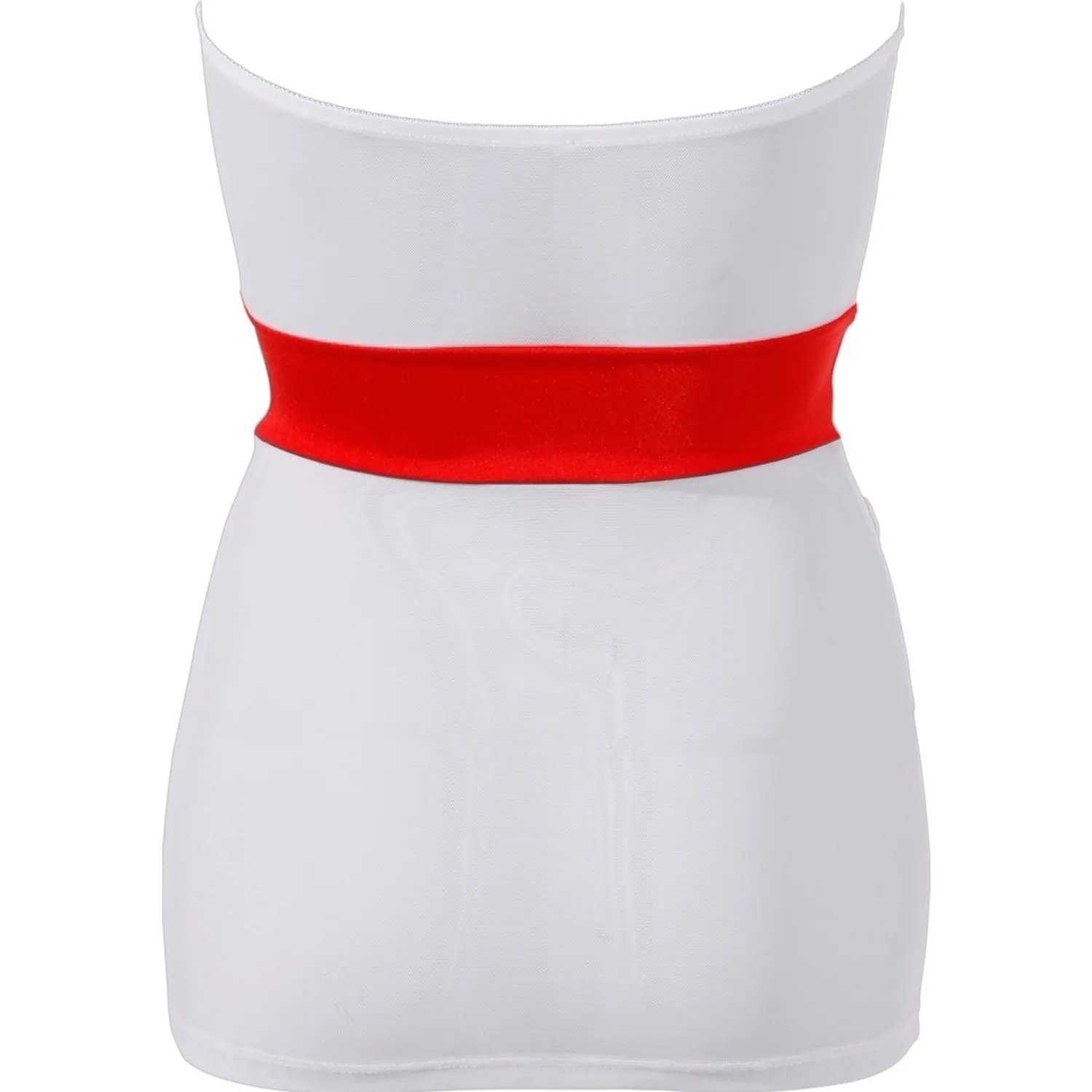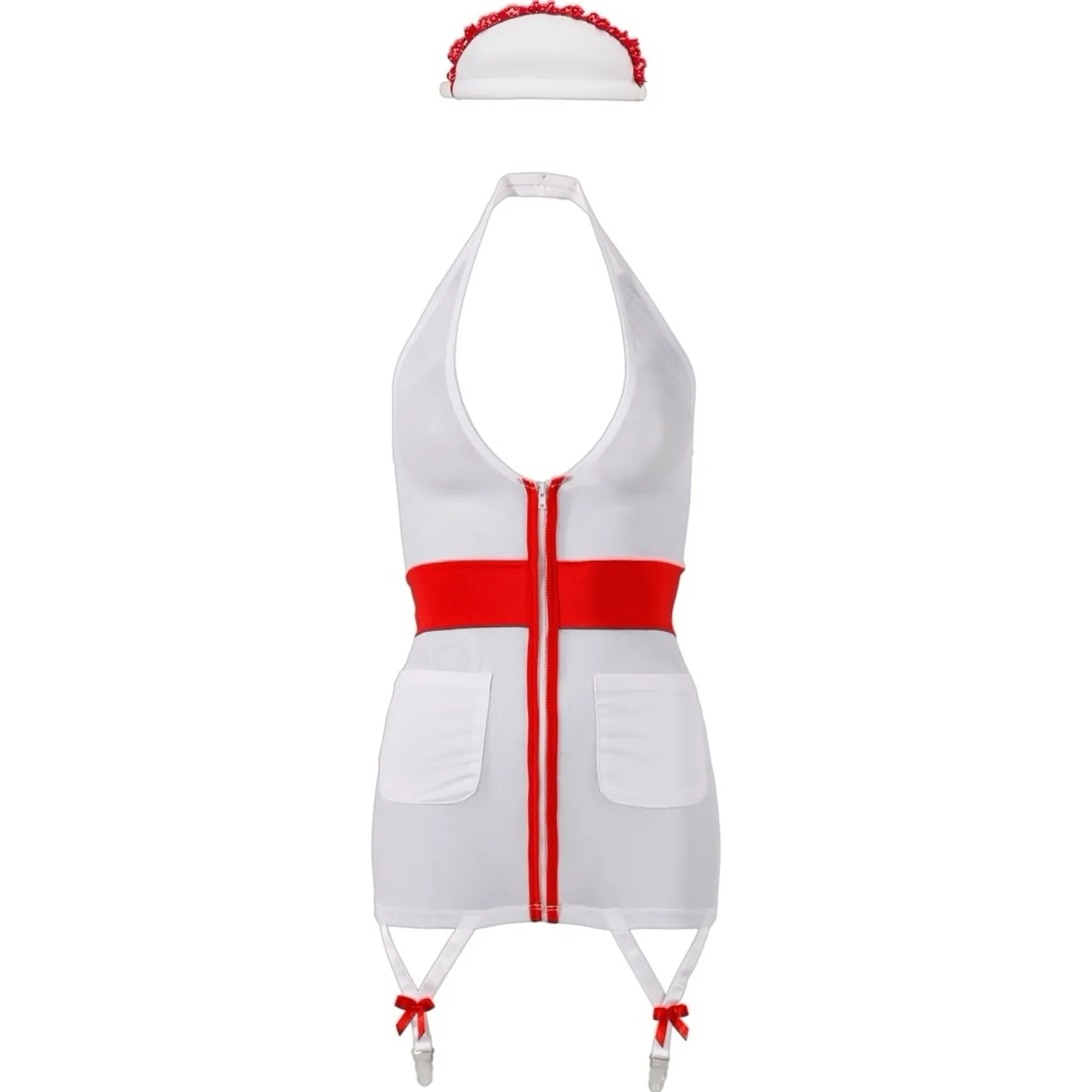 Costum tematic asistentă medicală! Rochie mini seducătoare din rețea albă cu inserții roșii, în aspect de cruce, în față. Lenjerie sexuală provocatoare de asistentă cu un fermoar care merge până la capăt, iar cealaltă inserție îți subliniază talia. Cu buzunare mici în bucată din față, unde pot fi păstrate tot felul de elemente mici, două bretele și halterneck pentru a face nerezistibilă vederea din spate.