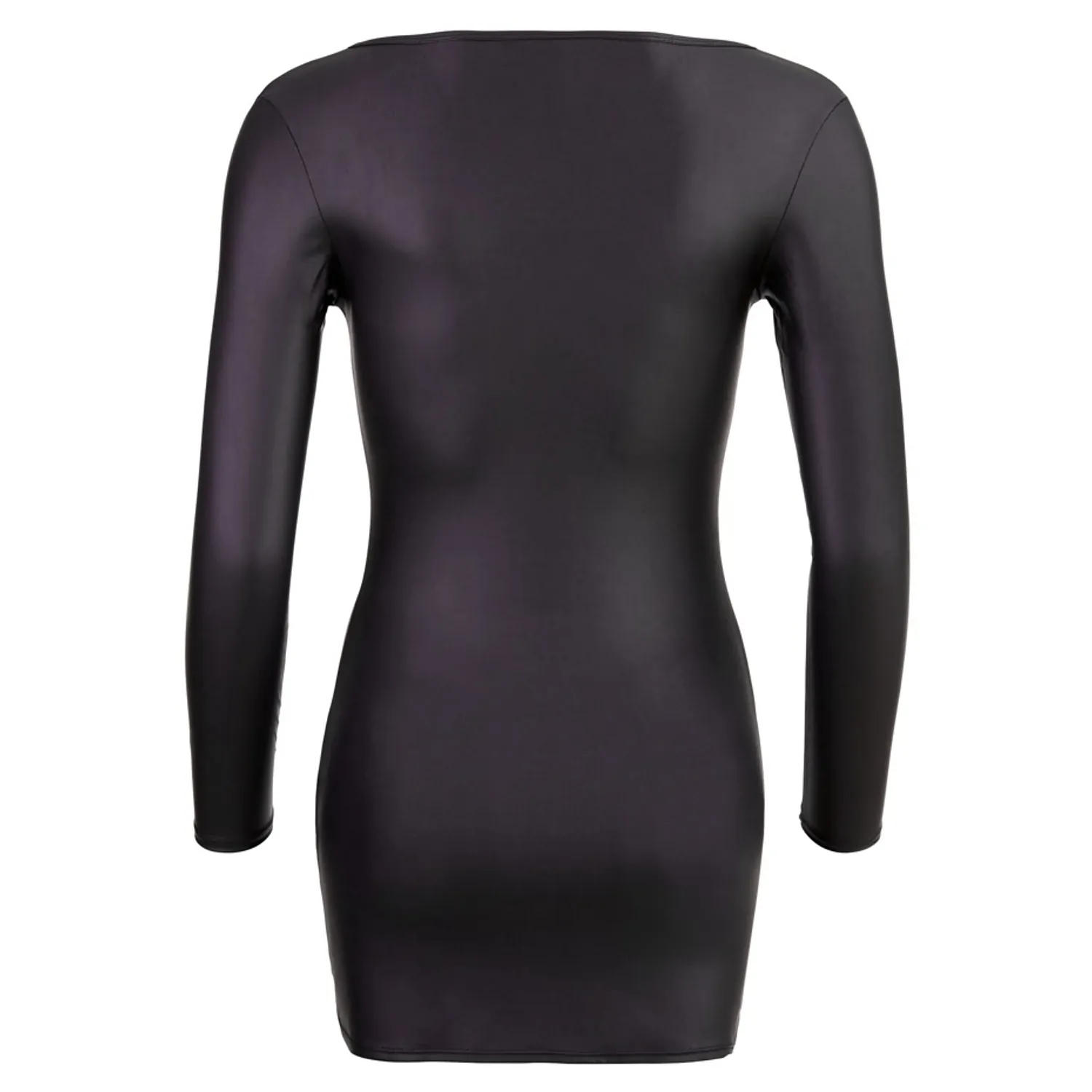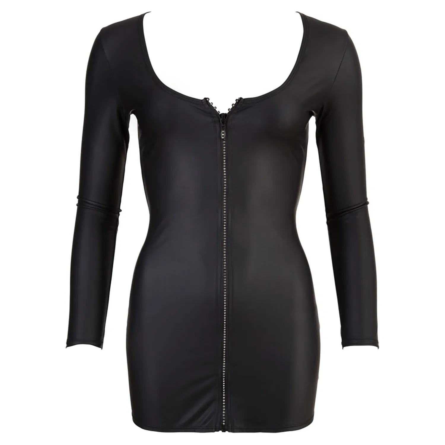 Rochia neagră mini, cu un braț lung, impresionează prin tăierea strânsă, care accentuează elegant și încântător curbele dvs. feminine, precum și un decolteu mare și un fermoar strălucitor în față.