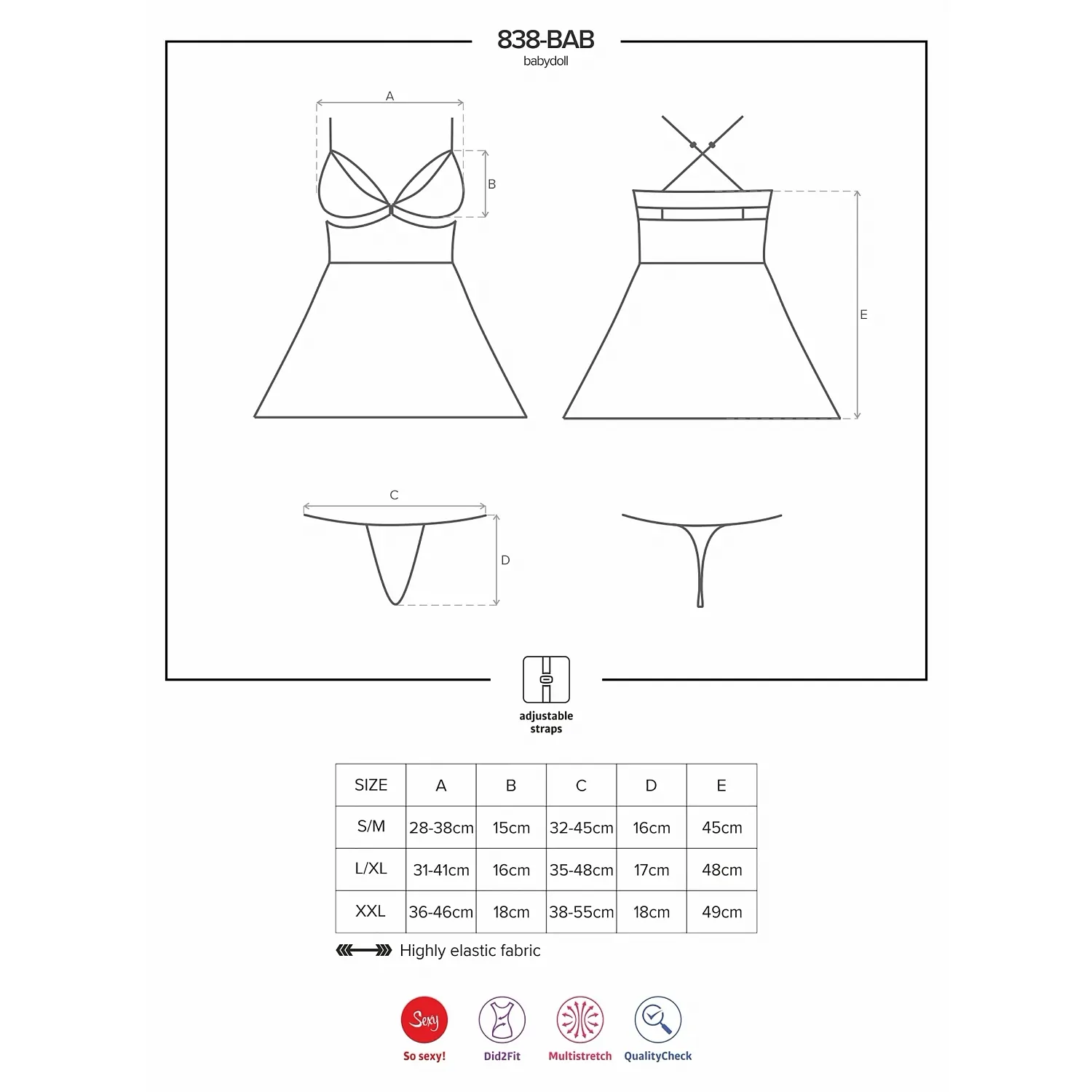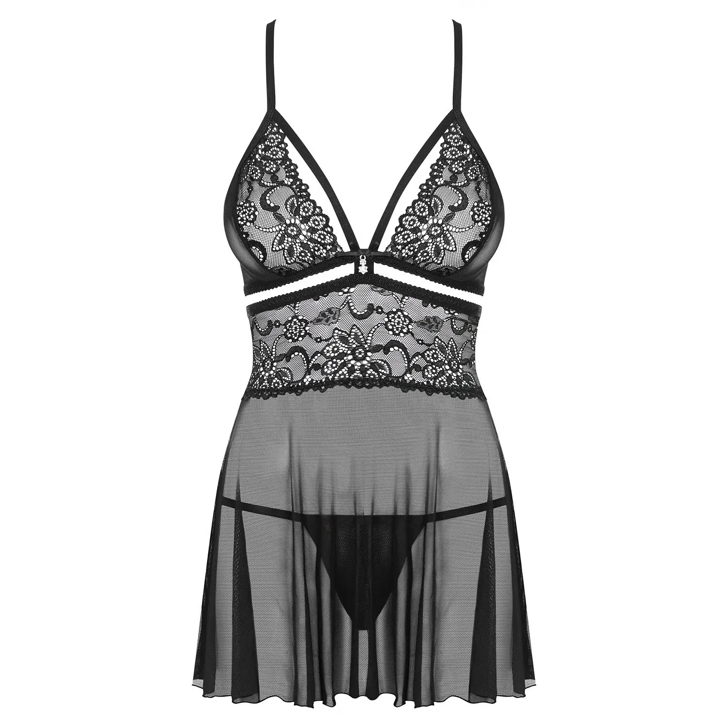 Un babydoll ce emană eleganță și senzualitate. Este conceput din voal fin în partea de jos, iar în partea de sus din volănaș ornată cu elemente florale. Decolteul adânc, decupajul de sub sâni, benzile dublate și bijuteria introdusă scoate în evidență bustul, atrăgând privirea ca un magnet către acea zonă. Bretele în X la spate sunt reglabile, pentru o ajustare perfectă. Articolul este fabricat dintr-un material elastic.