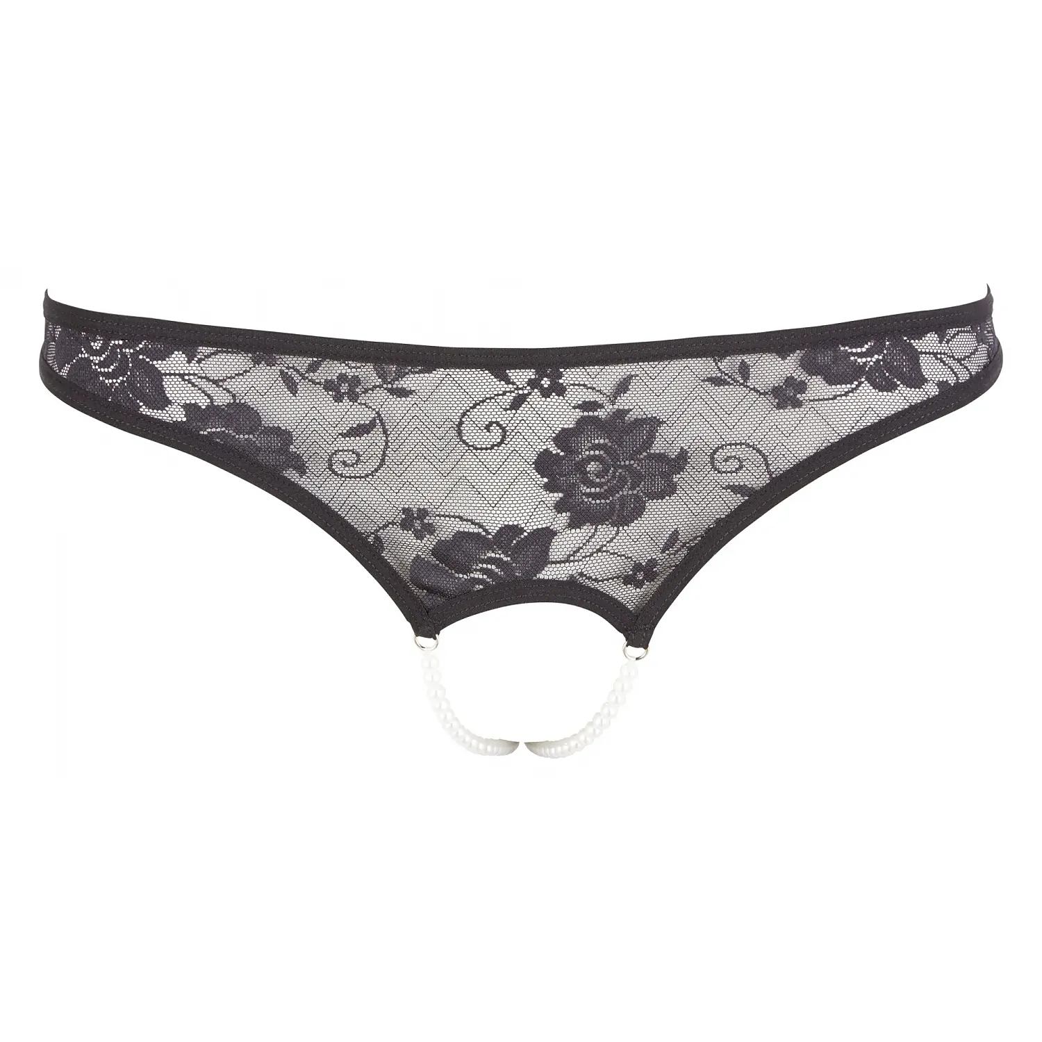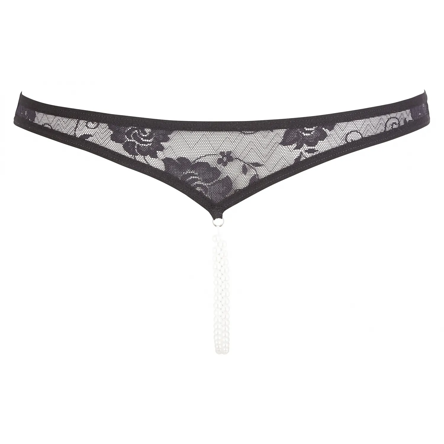 îmbrăcăminte sexuală femei, chiloți innegriti nice și eleganți, cu lanț și perle decorative, deschis în zona intimă.