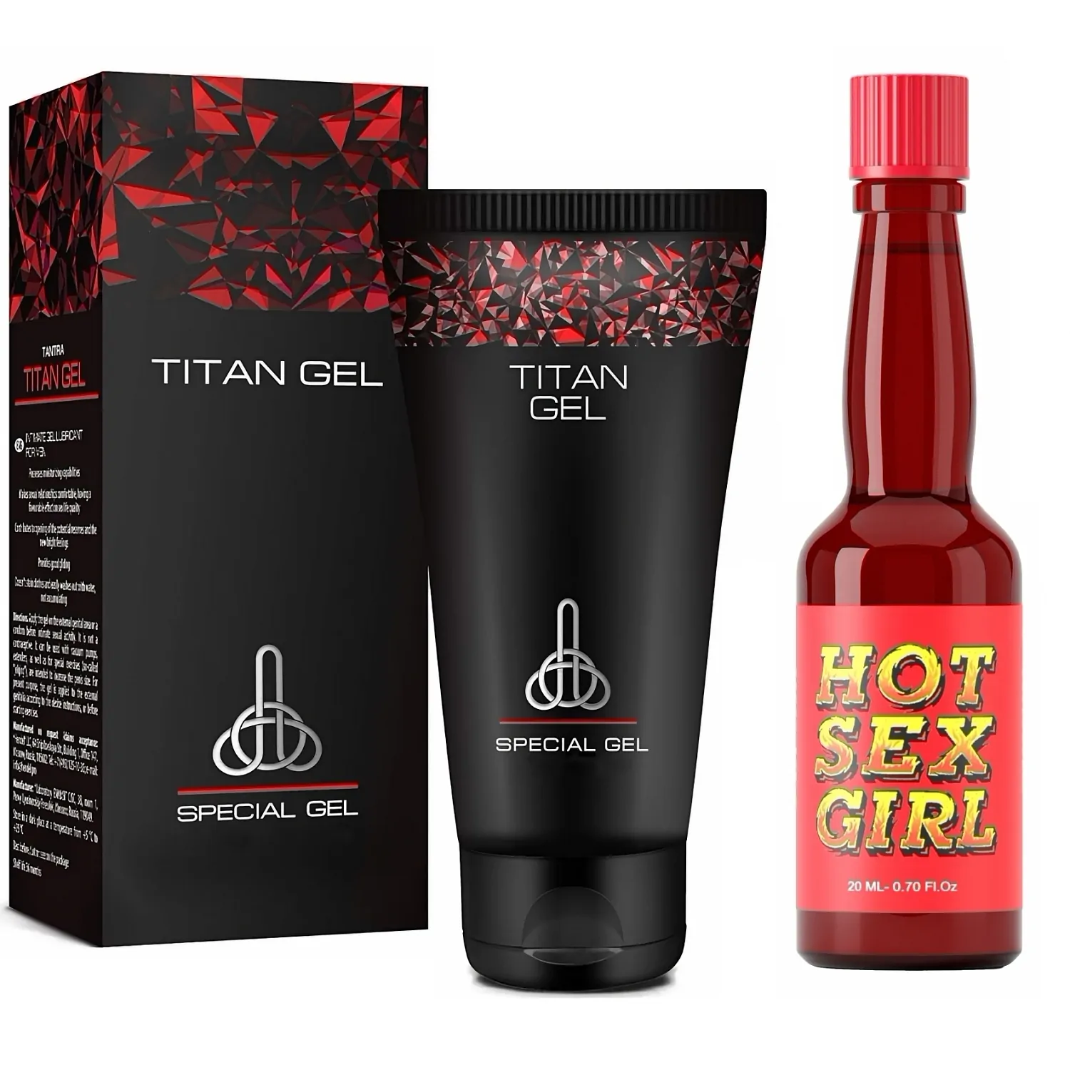 Pachet avantajos cu preț diminuat compus din Afrodisiac Pentru Femei Hot Sex Girl 20ml și Mărire Penis Unguent Titan Gel Autentic 50ml.