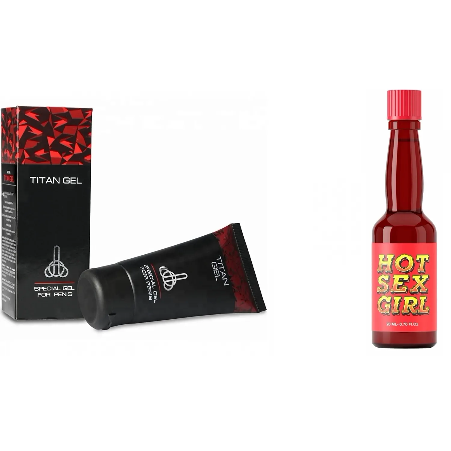 Pachet promoțional cu preț scăzut format din Afrodiziac Pentru Soții Hot Sex Girl 20ml și Creștere Penis Alifie Titan Gel Original 50ml.