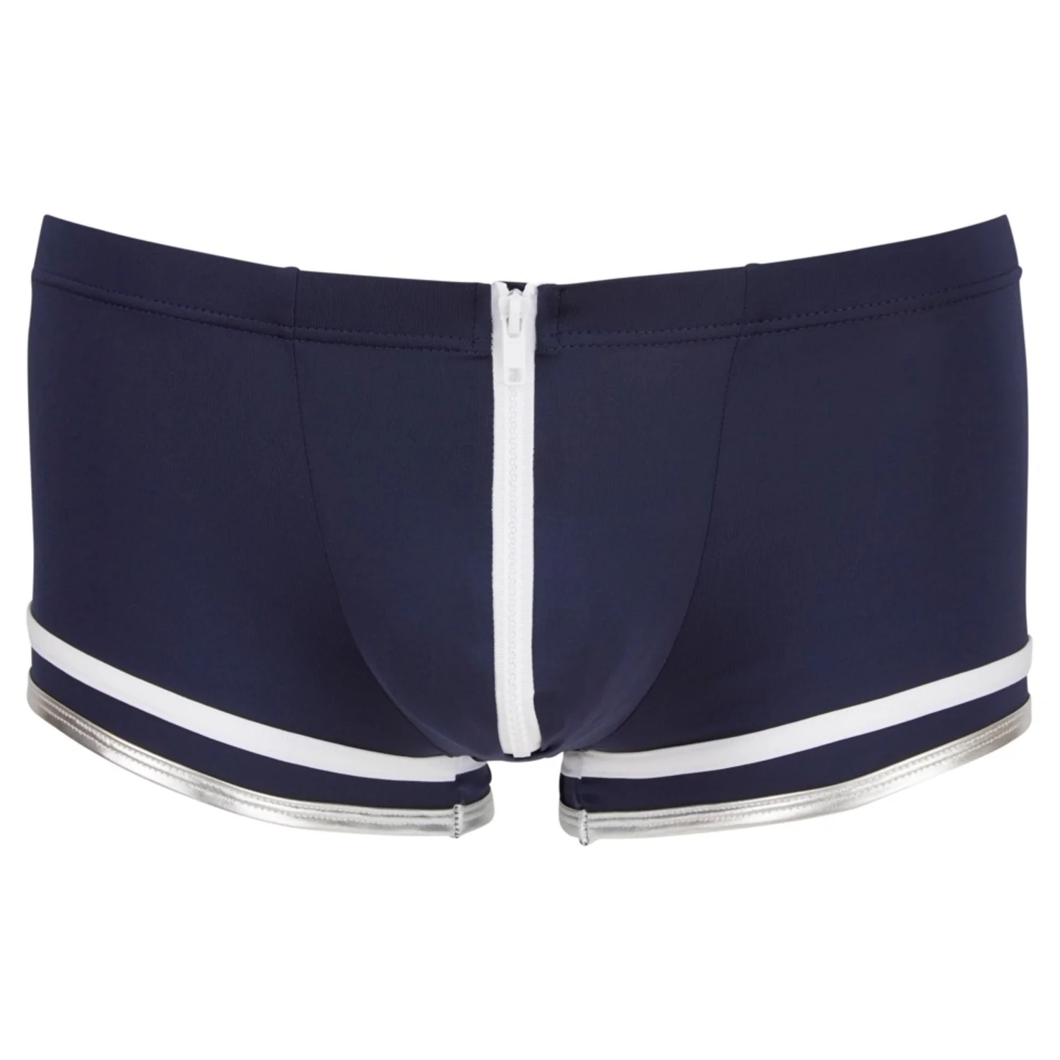 Iată boxerii albaștri cu un formă de marinar pe care l-ați așteptat. Un bun atu al tău va arăta atrăgător-maritim, ceea ce reprezintă că toți ochii vor fi cu siguranță asupra ta. Dungile de colorit albă și argintie din jurul picioarelor adaugă finisaje perfecte. Cu un fermoar alb, căptușit în față.