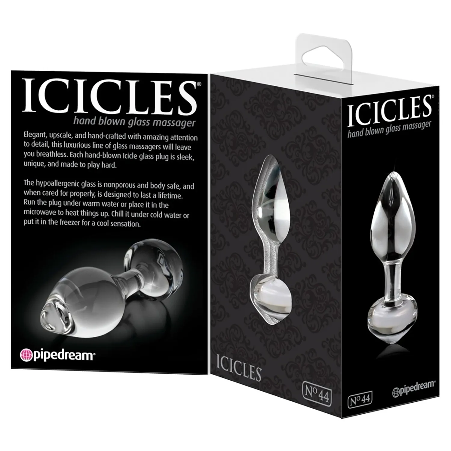 Dispune de un vârf conic care înlesnește inserarea, un trunchi bombat pentru trăiri intense, un gât subțire care permite mușchilor sfincterului să se relaxeze și o bază lată care îl păstrează în partea interioară în condiții de siguranță. Sticlă din care este realizat este hipoalergenică, neporoasă și dacă este întreținut corespunzător, Icicles No. 44 a fost proiectat să țină o viață întreagă.