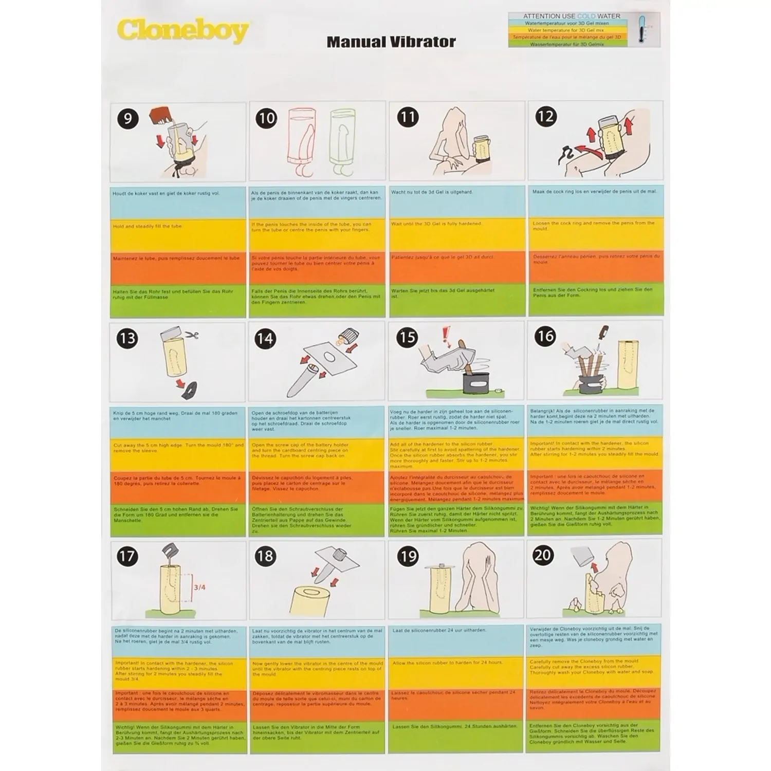 Acest kit este alcătuit din tot ceea ce ai nevoie pentru a-ți crea un vibrator. Pachetul include un inel pentru penis, 2 pachete de gel 3D, Silicon Skin Feel, cilindru de latex pentru stimulare, tub cilindric, vibrator, manual de instrucțiuni. Materialul din care este realizat Cloneboy imită dermă umană și este foarte simpatic la atingere. Deoarece acest kit conține 2 pungi de gel 3D, ai probabilitatea de a crea 2 penisuri. Cu securitate cea care va avea mai mult de câștigat va fi partenera ta. De acum nu se va mai simți nicicând singură căci vibratorul Cloneboy va fi în permanență aproape ea, chiar dacă tu ești plecat. Instrucțiuni de folosire Deși instrucțiunile sunt destul de ușoare, trebuie să le urmezi întocmai și să fii atentă la detalii. Ajutorul tău trebuie să rămână erect un pic, așa că întregul proces trebuie să implice o anumită stimulare.