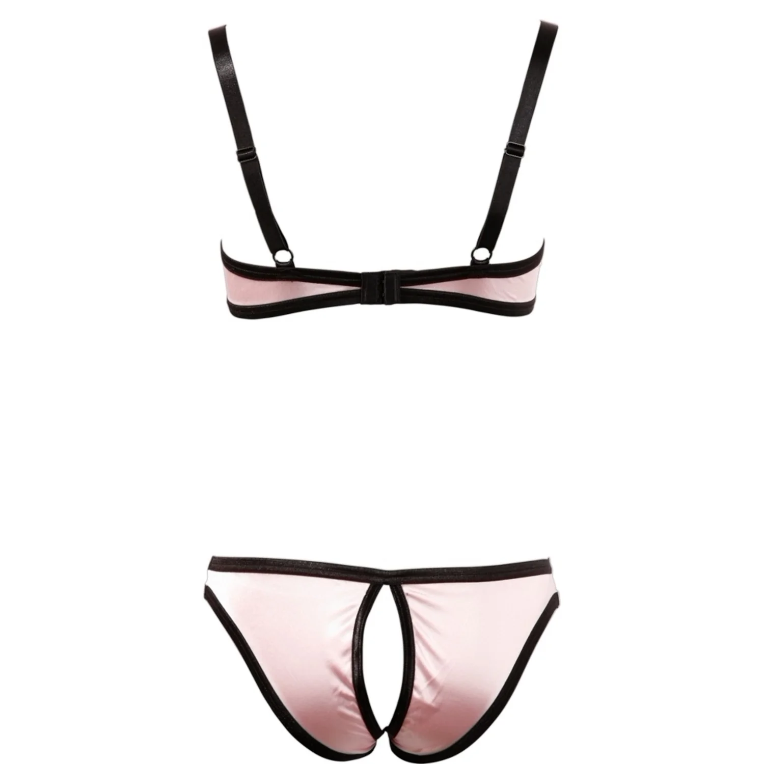 Pentru momente erotice! Set în culoare de trandafir satinat cu detalii negre. Bustieră cu cupe ușor căptușite și curele reglabile. Închidere în spate. Chiloții care se potrivesc sunt decupați inghinal. Ciorapii se pot comanda separat.