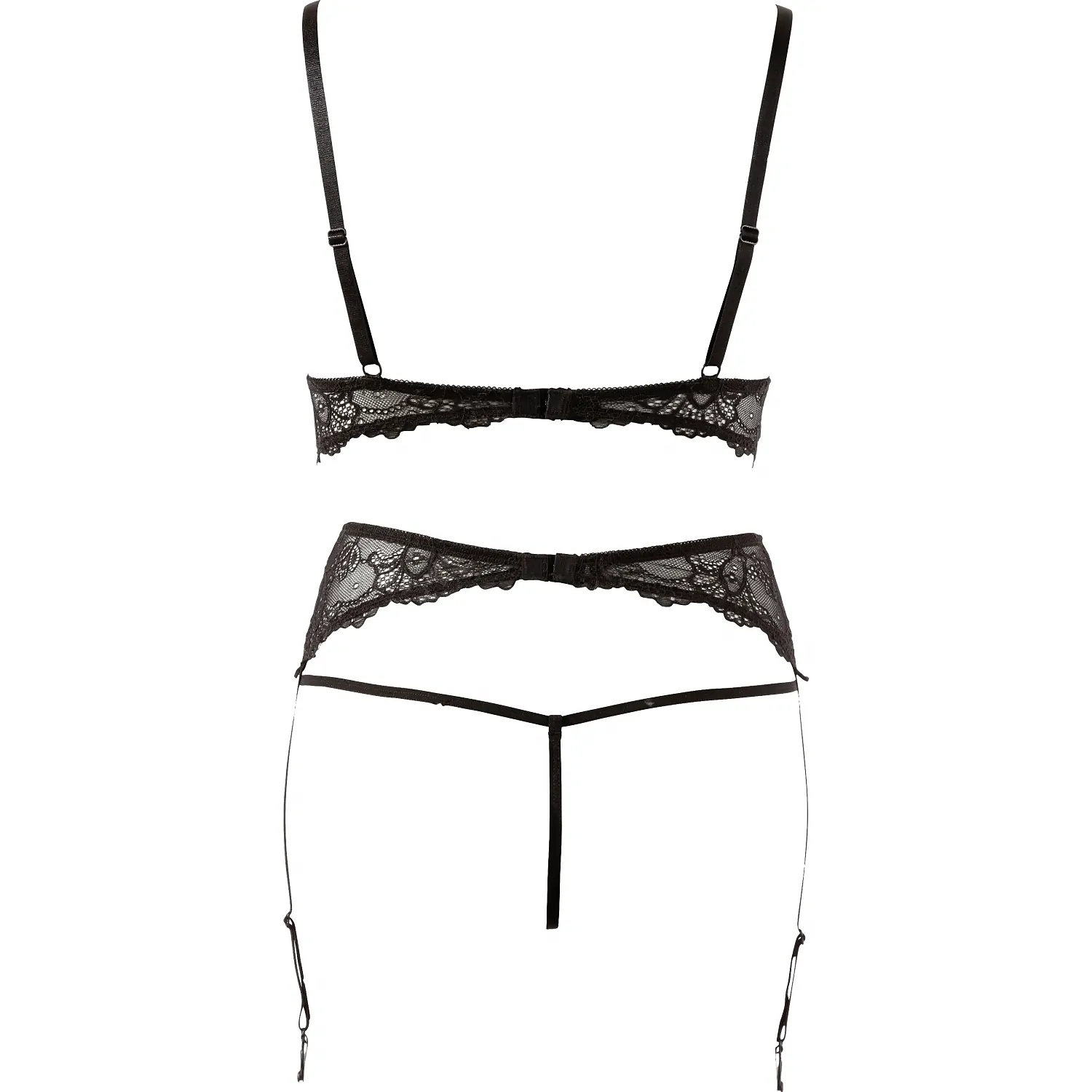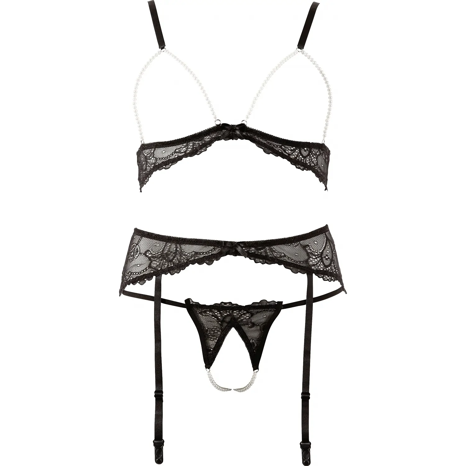 - Setul include un sutien din dantelă cu mărgele, un bikini cu ață deschis din dantelă cu mărgele decorative și o centură portjartier.