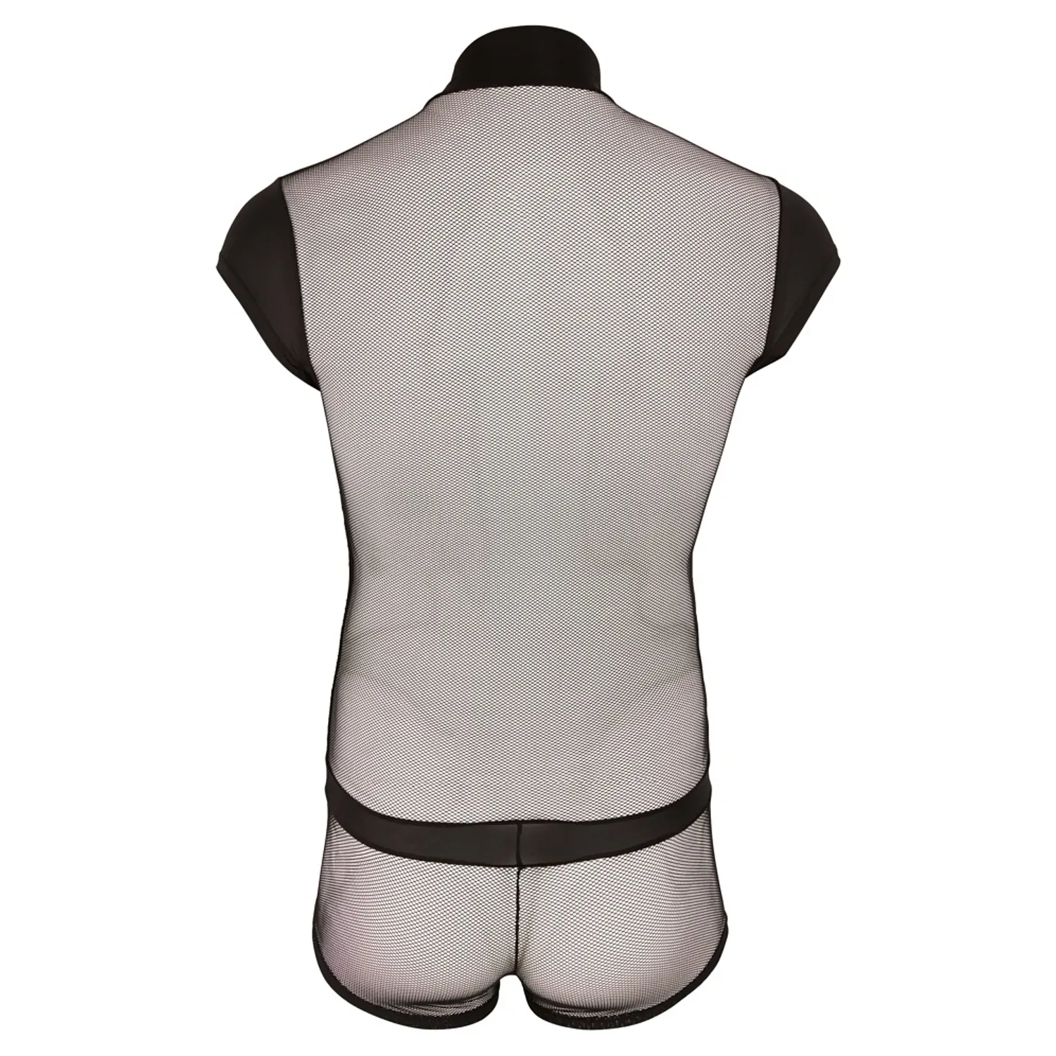 Body Overall negru pentru bărbați din 2 materiale diferite ce realizează un stil aparte dintr-o structură de linii. Cu fermoar în față și în zona intimă.