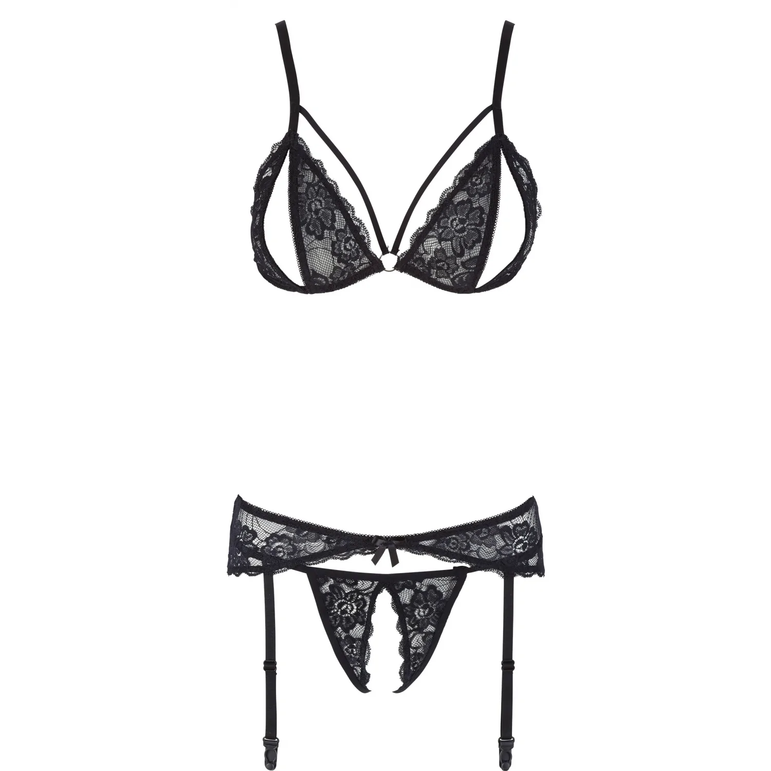 - Setul conține un sutien deschis care lasă sânii la vedere, cu un mic inel metalic între sâni de unde pornesc bretele elastice. - Chilot cu ață este deschisă în față și are bretele, permițând acțiuni rapide excluzând a fi nevoie să fie dată jos. - Portjartieră din dantelă are bretele reglabile pentru ajustarea lungimii. - Bretelele sunt elastice pentru confort maxim. - Sutienul are detalii cu bretele în zona decolteului și fante incitante în cupe, proeminente de un inel decorativ. - Ambele componente au un sistem practic de închidere cu clips la spate.