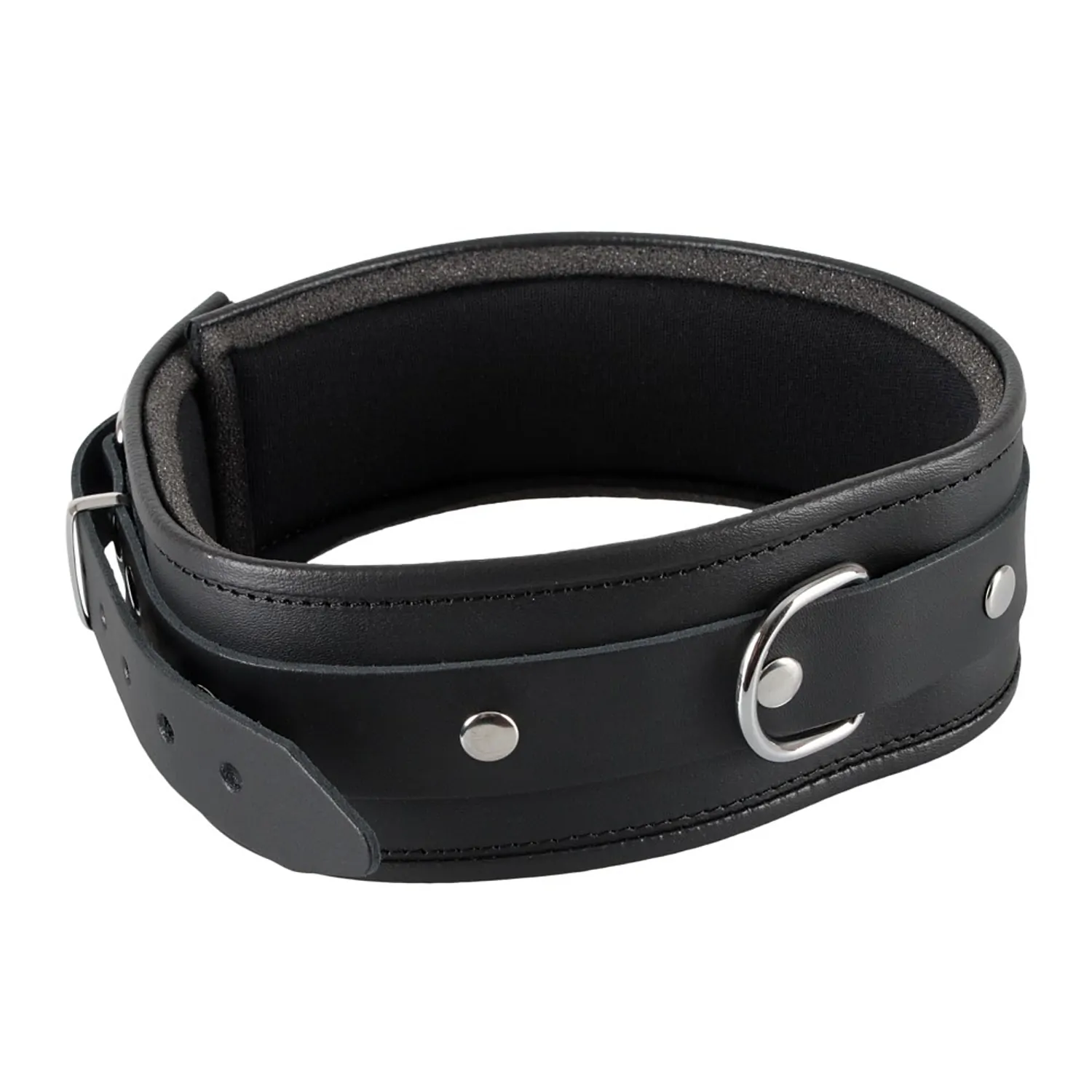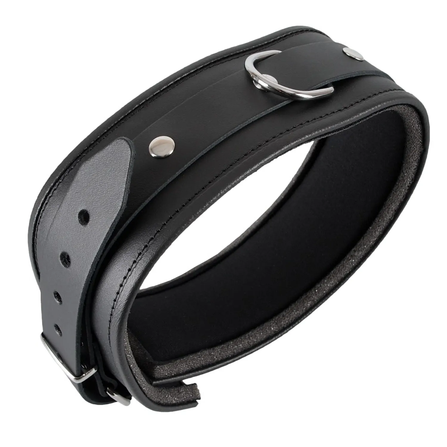 Zgardă bondage din tegument naturală cu inel metalic și cataramă reglabilă la spate. material piele firească groasă.