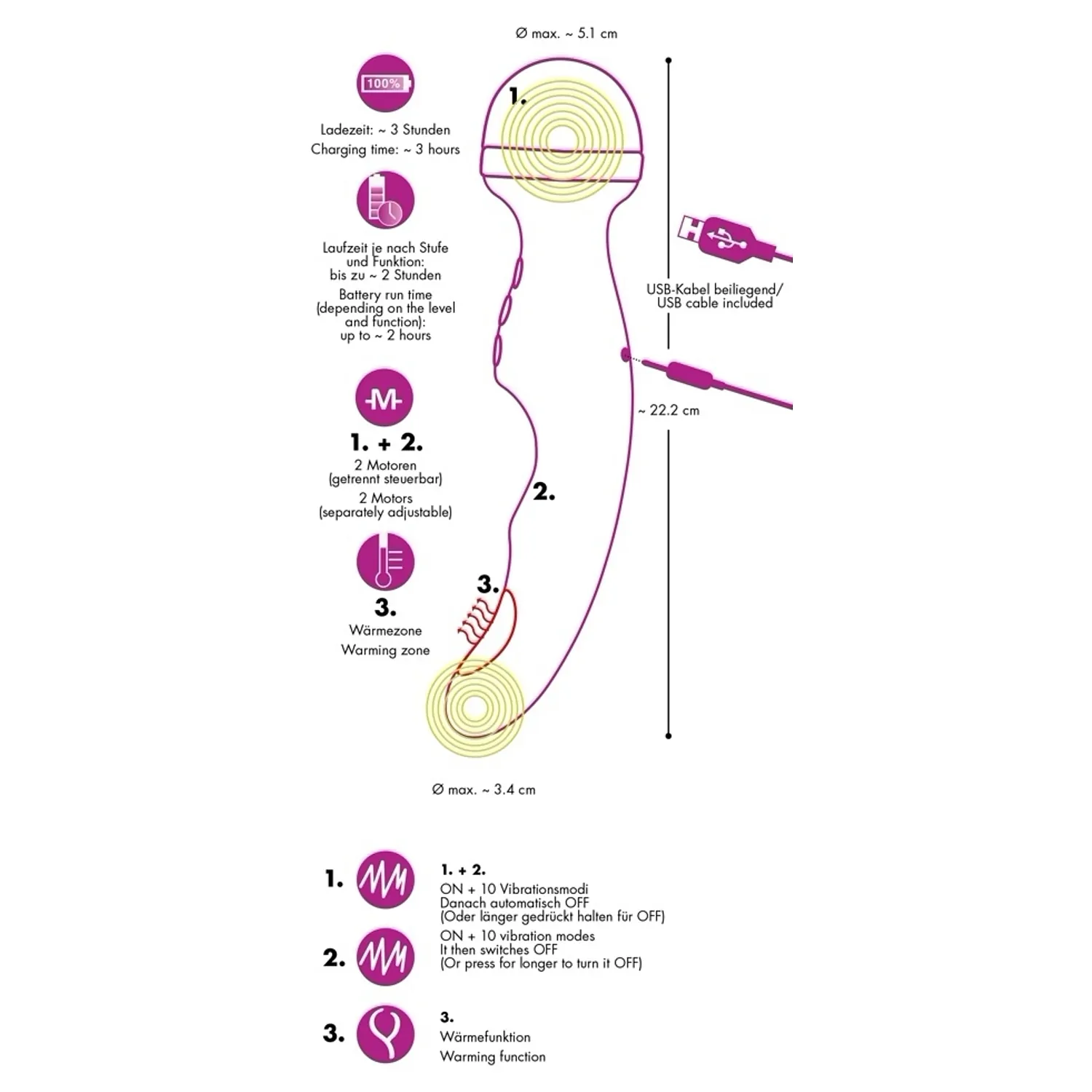 Nu puteți decide dacă vreți un vibrator sau o baghetă de masaj? Ei bine, nu trebuie, căci această jucărie roz este amândouă - un dăruitor de desfătare 2 în 1 pe care îl puteți răsuci și transforma atât cât doriți. Puteți decide dacă doriți să vă bucurați de o stârnire blândă sau mai puternică, fiindcă bagheta de masaj are 10 moduri de vibrație diferite. Butonul de sub cap reglează modurile de vibrație. Și un important amănunt - vibratorul are și o funcție de încălzire pe porțiunea curbă interioară care încălzește vibratorul până la o temperatură plăcută. Funcția de încălzire poate fi, desigur, controlată separat de modurile de vibrație și, prin urmare, poate fi utilizată fără a porni vibrațiile. Poate fi reîncărcată cu cablul USB inclus.