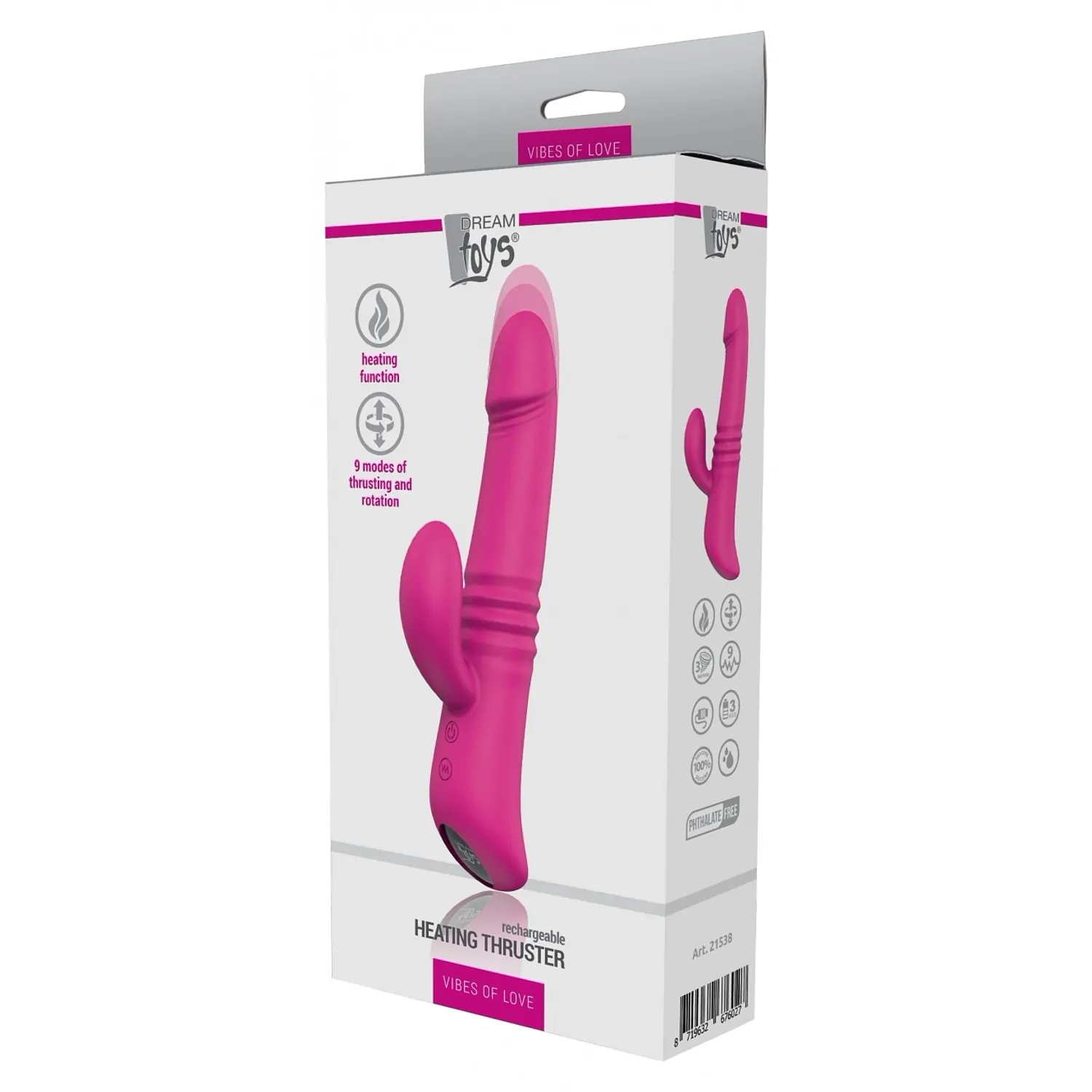 DREAM TOYS HEATING THRUSTER MAGENTA este un vibrator cu stimulator clitoridian, funcție de încălzire și mișcare sus-jos.