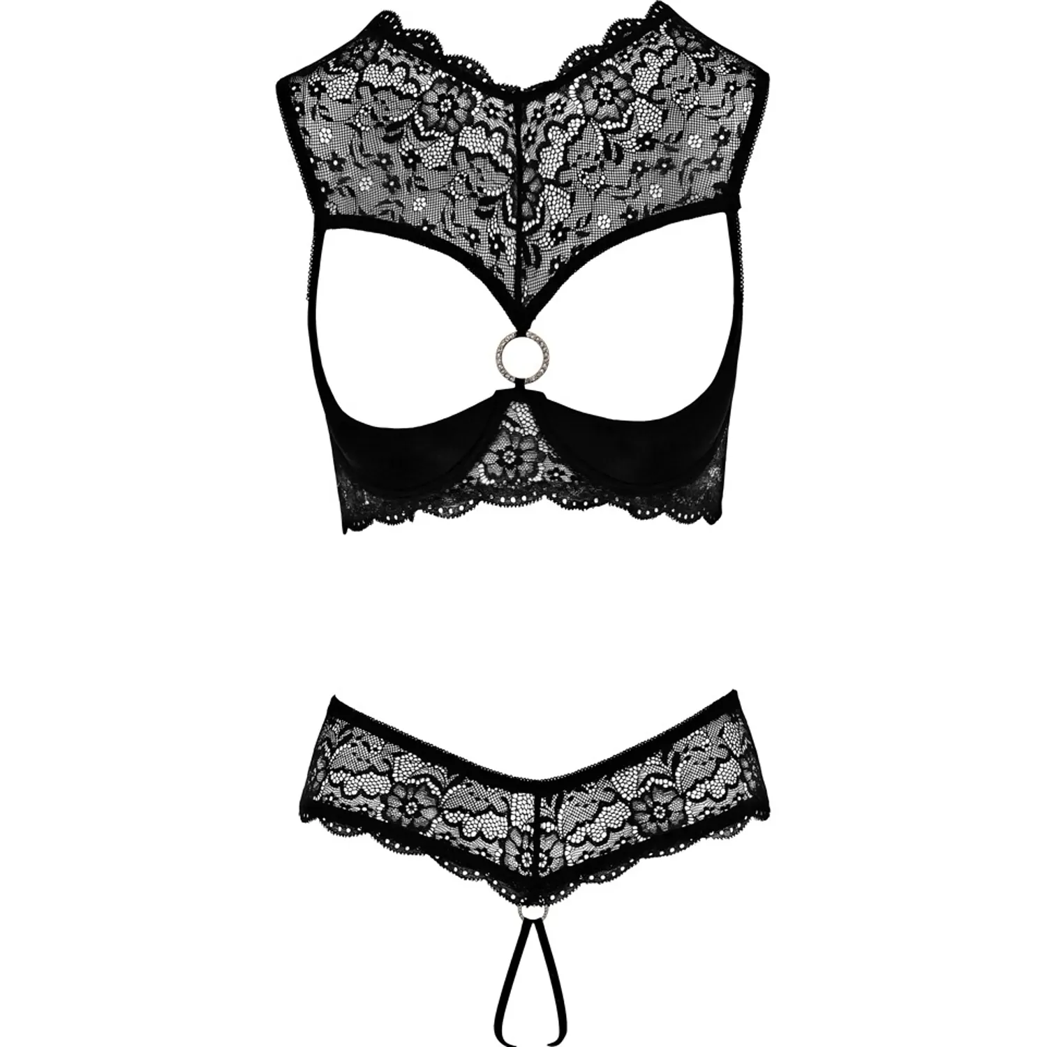 Acest sutien frumos mulează sânii și îi face centrul atenției. Cupele ușor căptușite ridică sânii și volănaș îi încadrează de minune, în timp ce inelul scânteios atrage atenția privitorului, astfel încât acesta privește cel mai important lucru. Chilotul este tăiat și este decorat cu un tiv de dantelă și curele întinse.