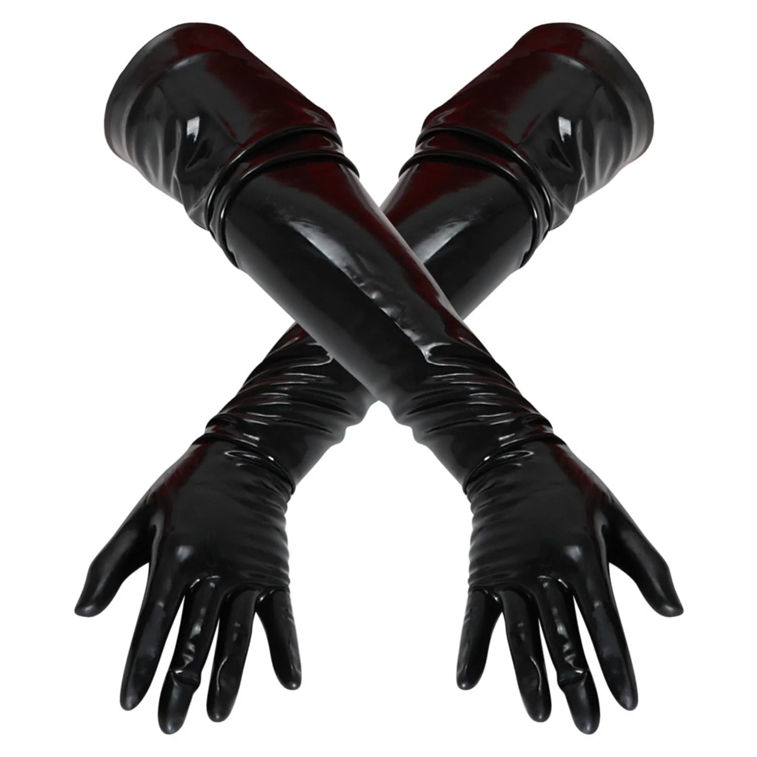 Mănuși din latex natural, negre, cu strălucire intens, lungime până la cot. Se mulează pe mână pentru mobilitate bună și un look statement la ținute de club, costume sau ședințe foto. Grosime 0,35 mm.