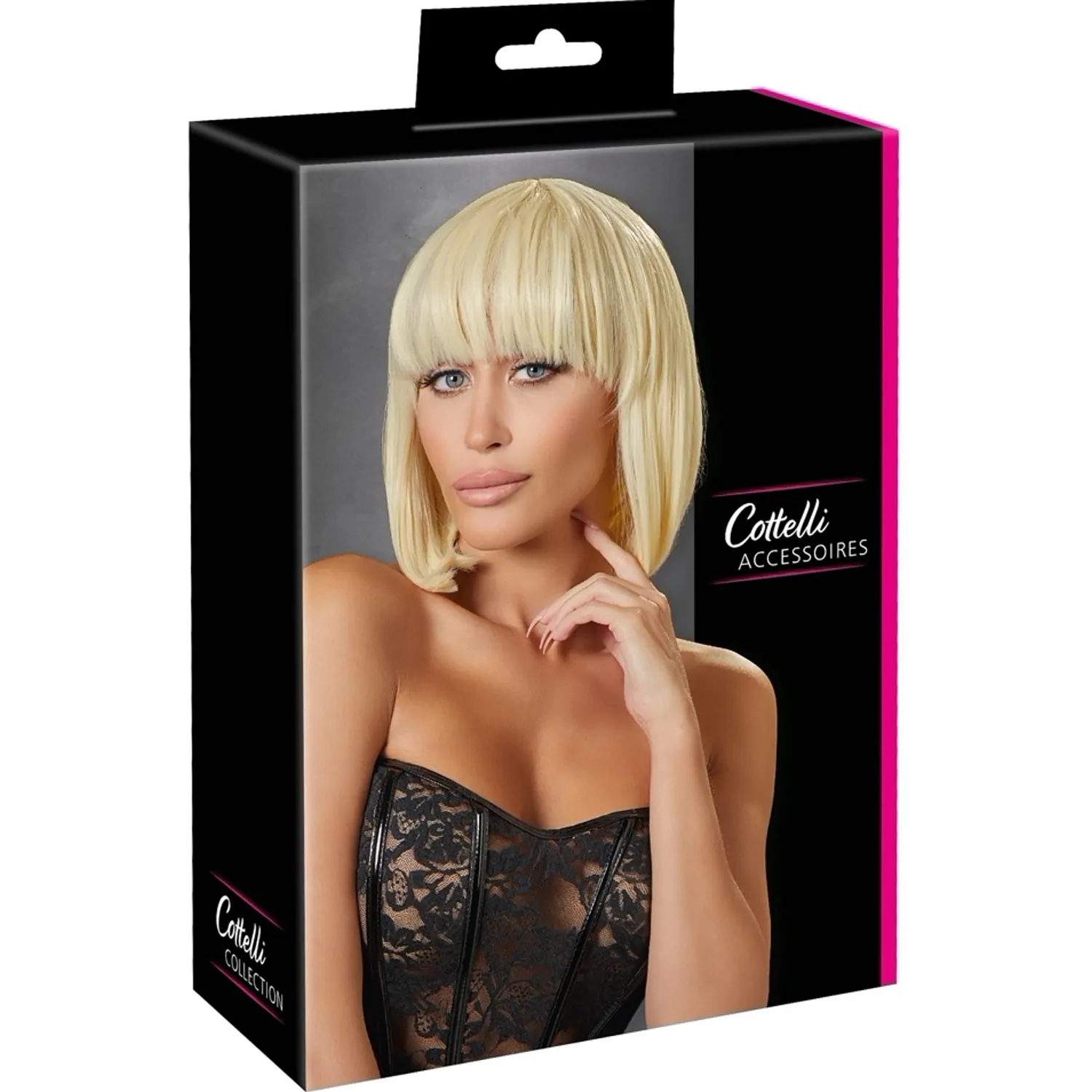 Perucă blond, tunsă bob cu breton, în extindere totală de 28 cm. Interiorul este ajustabil, adecvat oricărei dimensiuni. Se poate tunde sau ajusta, și se utilizează șampon special pentru peruci în scopul curățării.