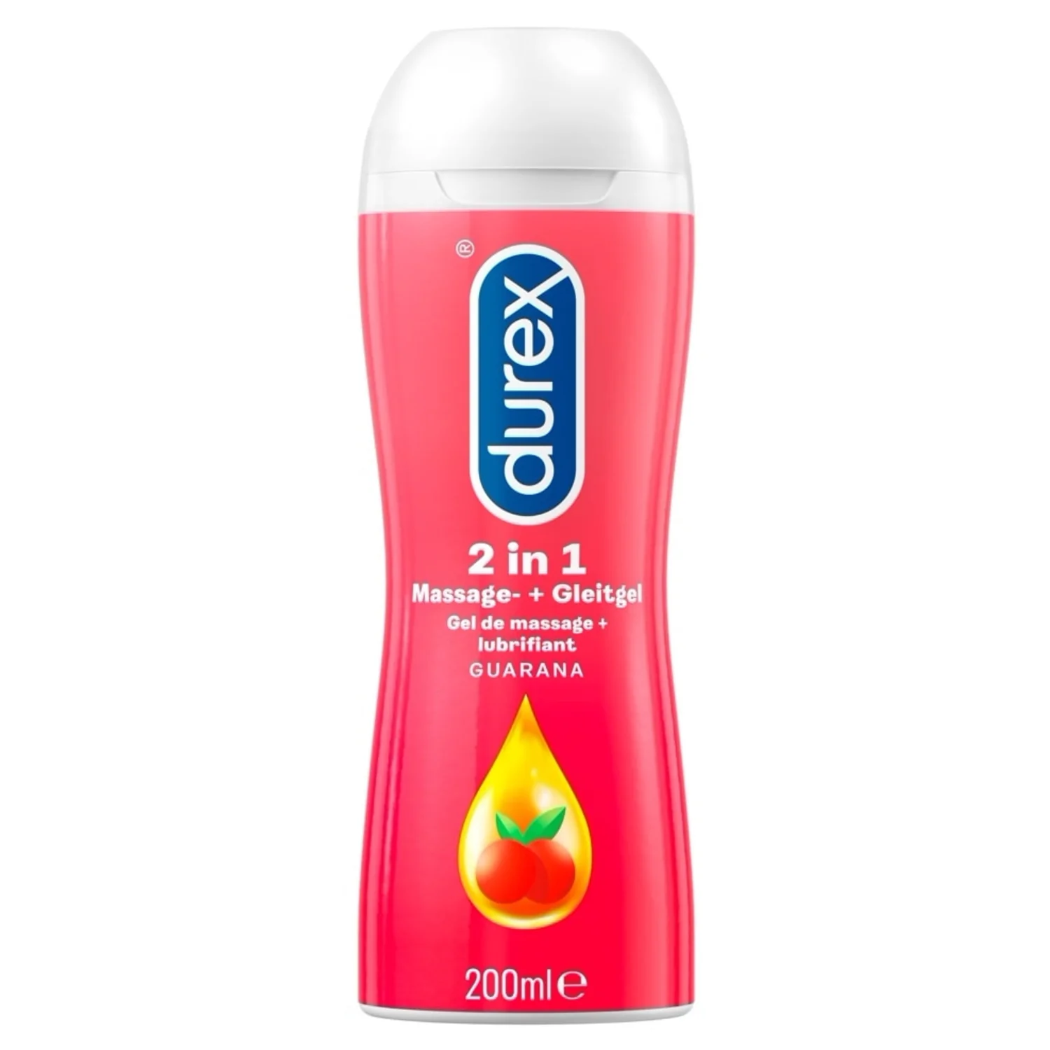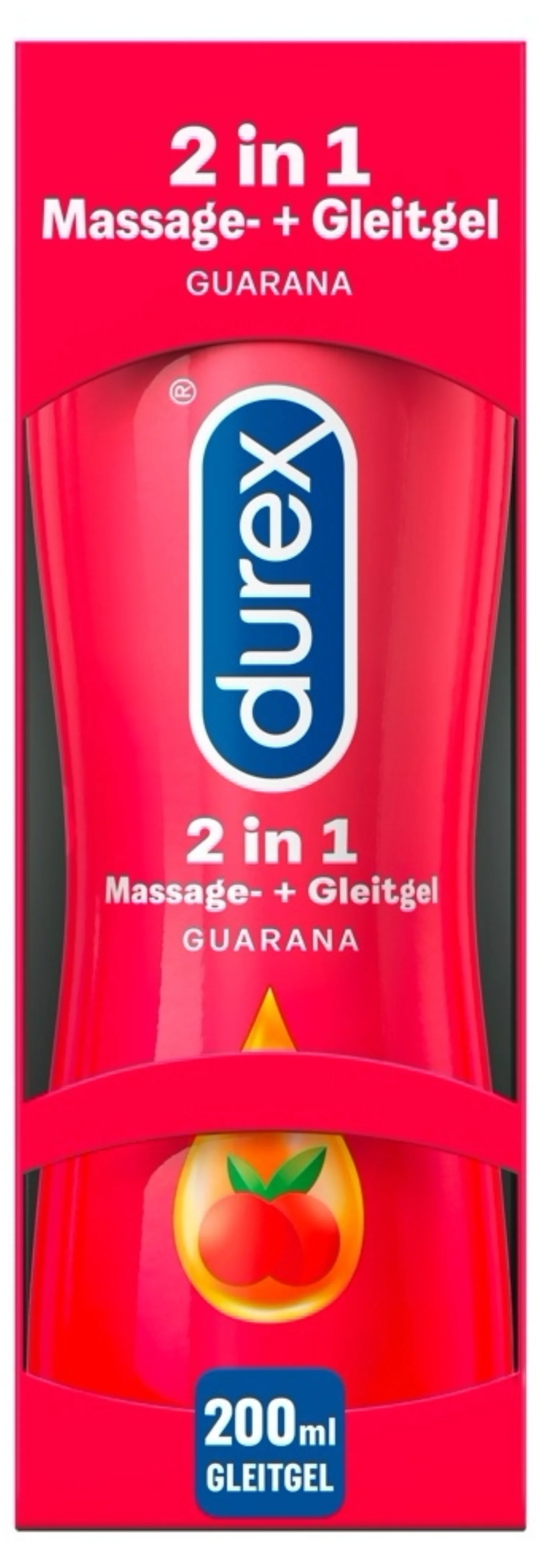 Lubrifiantul Durex Play - Massage 2in1 este un produs ce conține extras de Guarana, ce se găsește în fluviul Amazon, mai precis în Brazilia. Acest lubrifiant este bogat în cofeină, crește vigilența, starea de spirit și condiția fizică. Se poate folosi atât în zonele intime, ca și lubrifiant, cât și pe toate zonele corpului ca și ulei de masaj, în raport cu consistenței sale netede și mătăsoase.