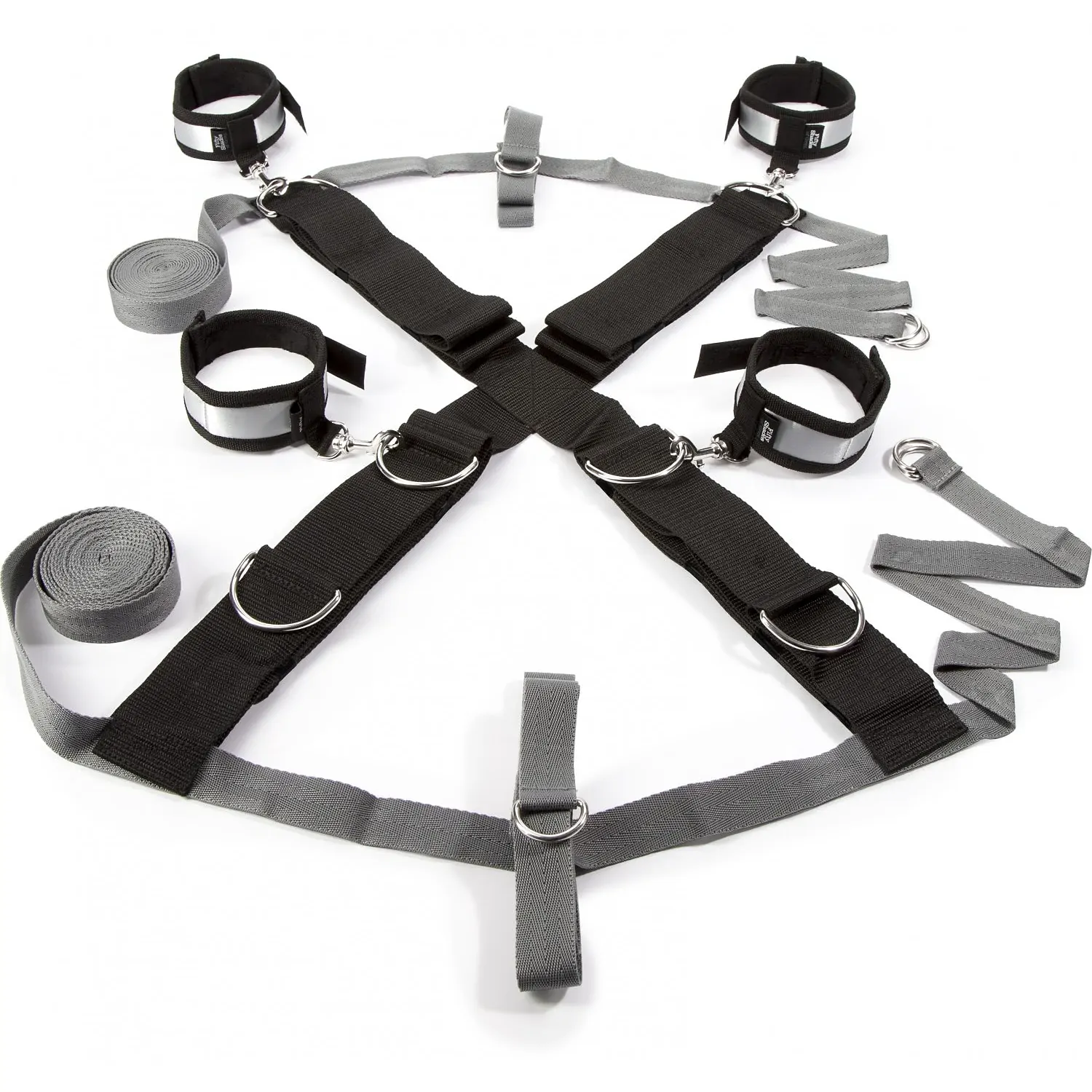 Sistemul permite manșetelor pentru glezne și membre să fie poziționate atât vertical cât și orizontal. Atât legăturile de mâini cât și cele de glezne sunt făcute din resurse de calitate premium cu un exterior din mătase moale, interiorul căptușit cu blană artificială pentru o practică cu adevărat confortabilă. Fixate de velcro, sigilează complet, manșetele care devin necomplicat de utilizat atât pentru cel legat cât și pentru cel care dictează regulile jocului. Sistemul de reținere este ușor de configurat și nu necesită unelte pentru asamblare, doar un pat dublu de indiferent ce dimensiune.