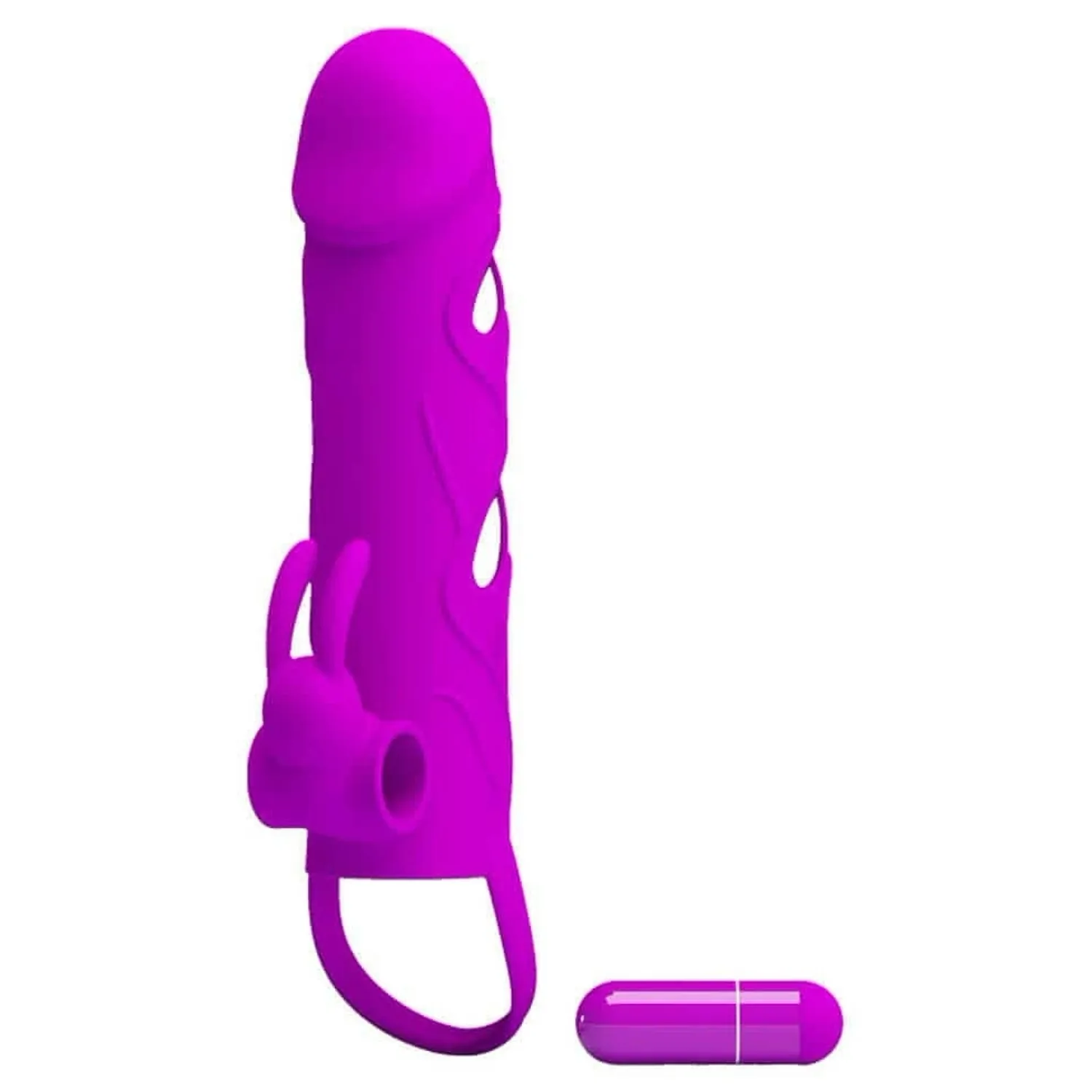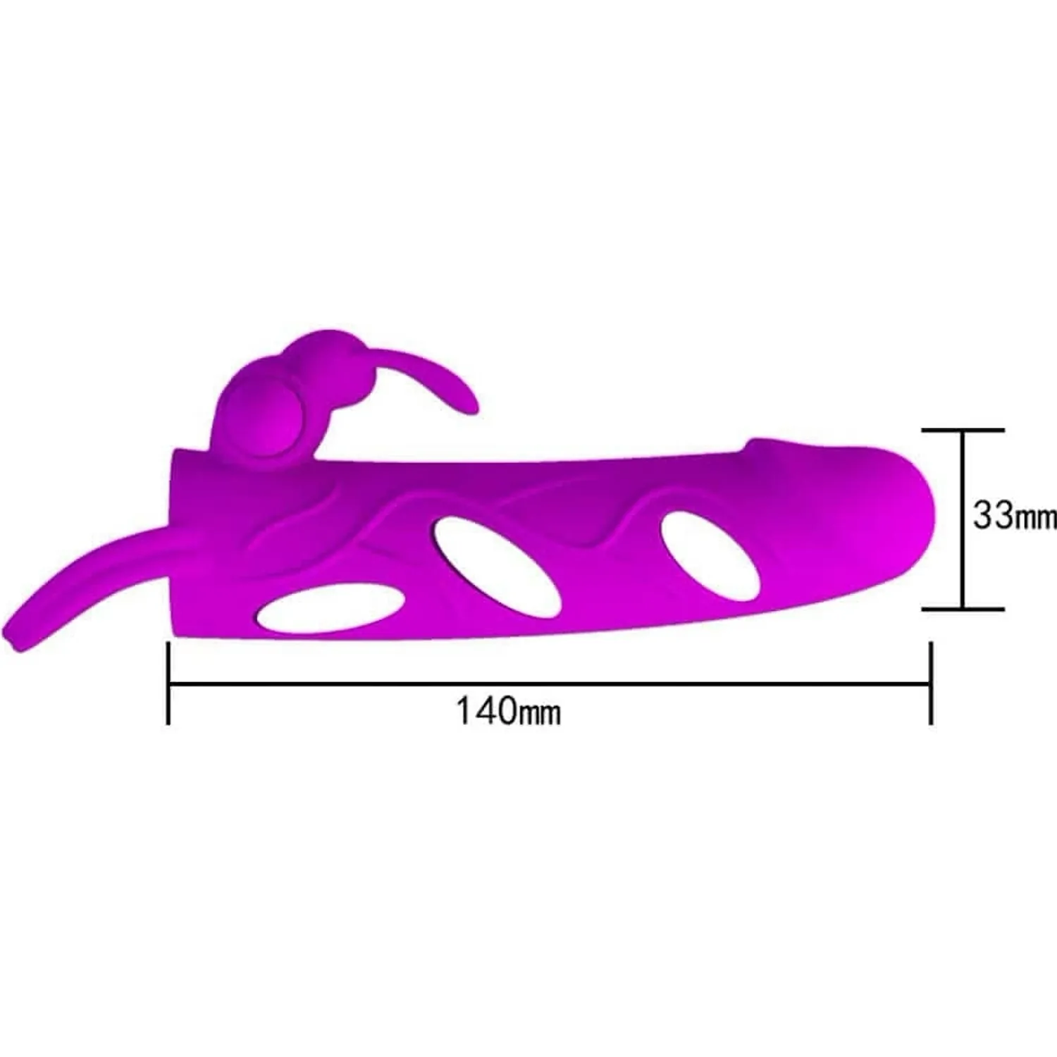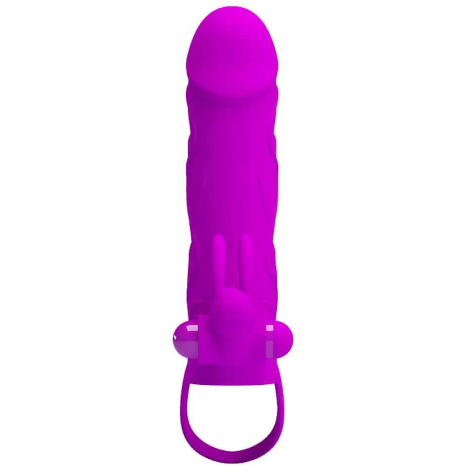Manșonul Pretty Love cu vibrații este din silicon, extrem ușor de folosit, se trage pe sex ca un prezervativ. Este însoțit de un stimulator clitoridian sub formă de iepuraș, oul vibrator este detașabil. Prelungește membrul cu 2,5cm și îmbracă penisul cu o textură din silicon cu cute pentru senzații de stimulare, iar la bază este însușit cu un iepuraș - stimulator pentru clitoris cu vibrații. Este mai ușor de îmbrăcat decât un prezervativ, doar puneți-l pe penisul erect, fixați-l la bază după testicule cu inelul cu care este prevăzut și lăsați delectarea să vă învăluie pe amândoi.
