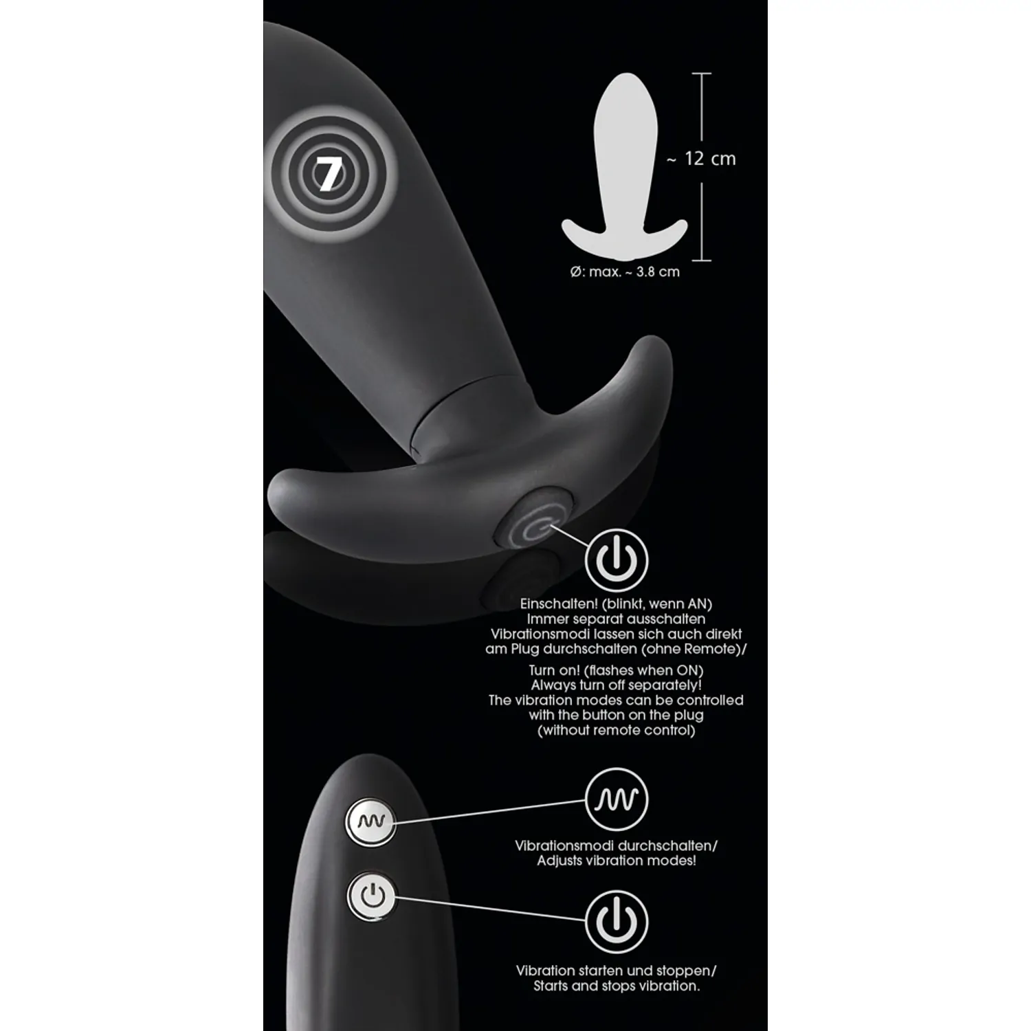Plăcere anală la apăsarea unui buton! Obțineți acest vibro-plug închis la culoare și bucurați-vă de vibrații interesante. Anal plug-ul alunecă aproape singur, în raport cu formei conului și a suprafeței moi catifelate. Baza în înfățișare de ancoră vă va asigura că dopul rămâne pe loc, astfel încât să vă poată stimula cu cele 7 chipuri de vibrație diferite. Folosiți butonul sau telecomanda inclusă pentru a regla vibrațiile sau dați-i iubitului dvs. și lăsați-l să vă surprindă cu vibrațiile.