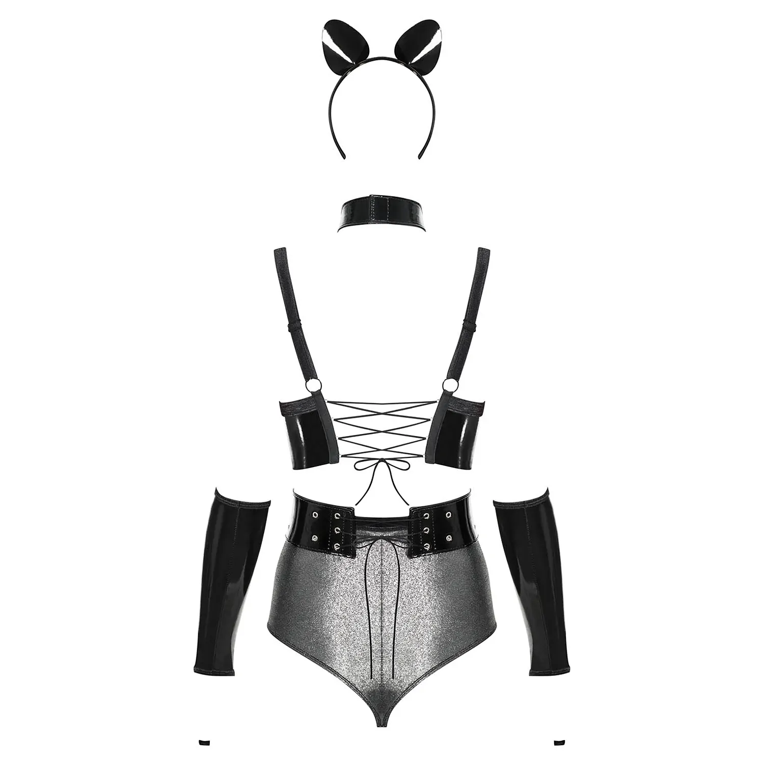 Costum sexy de pisicuță format din sutien, chilot, bentiță, mănuși, cingătoare și accesoriu pentru gât.