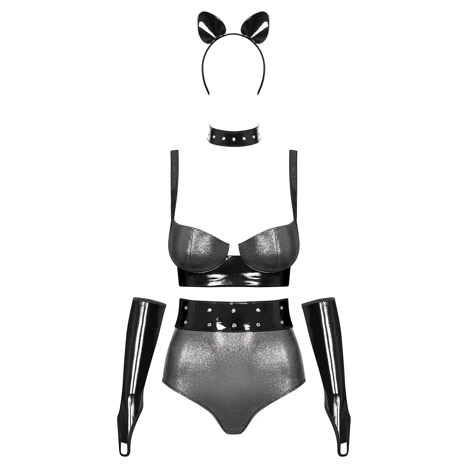 În seara asta dezlănțuie felină din tine! Acest ținută Pisicuță Obsessive Silveria Gri sexual este meșteșugit din material elastic în combinație cu material lucios. Sutienul are cupele întărite, bretelele sunt ajustabile și se închide la spate cu ajutorul unui șnur. Panty-ul bikini cu ață cu mijloc înaltă este fabricat tot din material elastic de culoare gri, iar cureaua, cu accesorii metalice, îi completează perfect. Setul conține mănușile care se prind pe degete, accesoriul pentru gât și urechiușele tematice. Articolul este lucrat dintr-o țesătura cu elasticitate.
