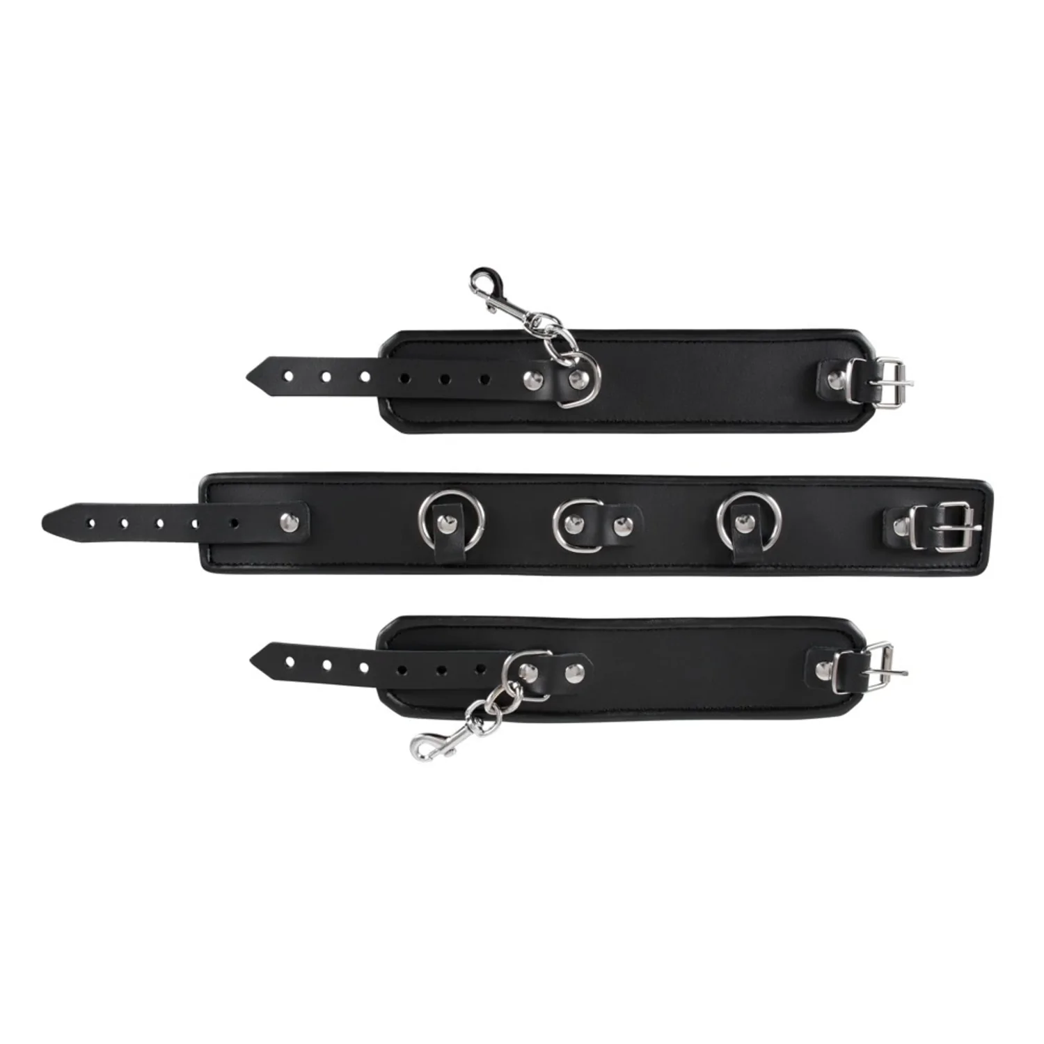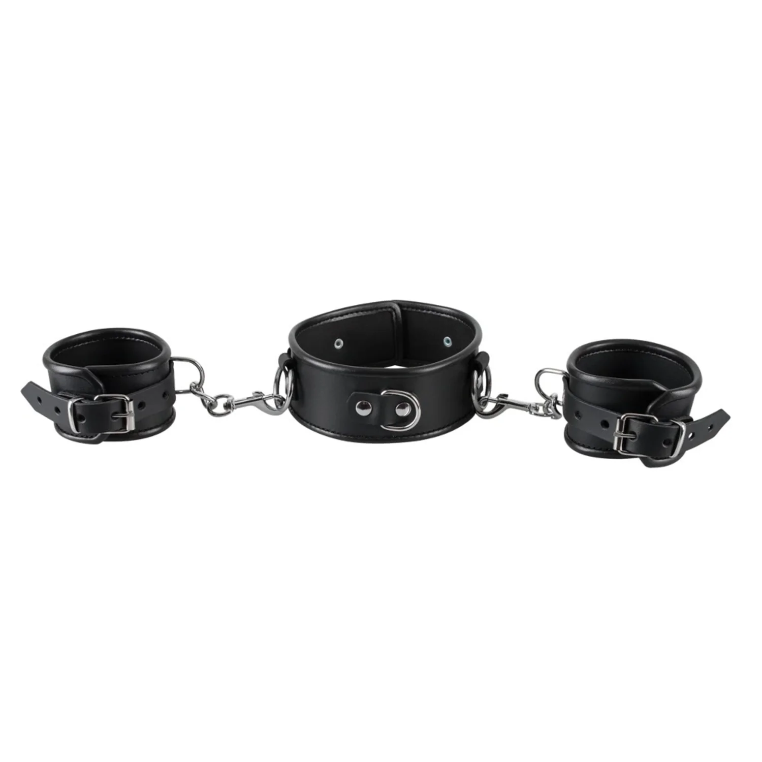 Pentru aventuri sexuale captivante! Zgarda pentru gât și cătușe pentru mâini din epidermă firească prinse între ele cu inele D și carabine metalice. Toate sunt reglabile prin catarame și carabine metalice detașabile.
