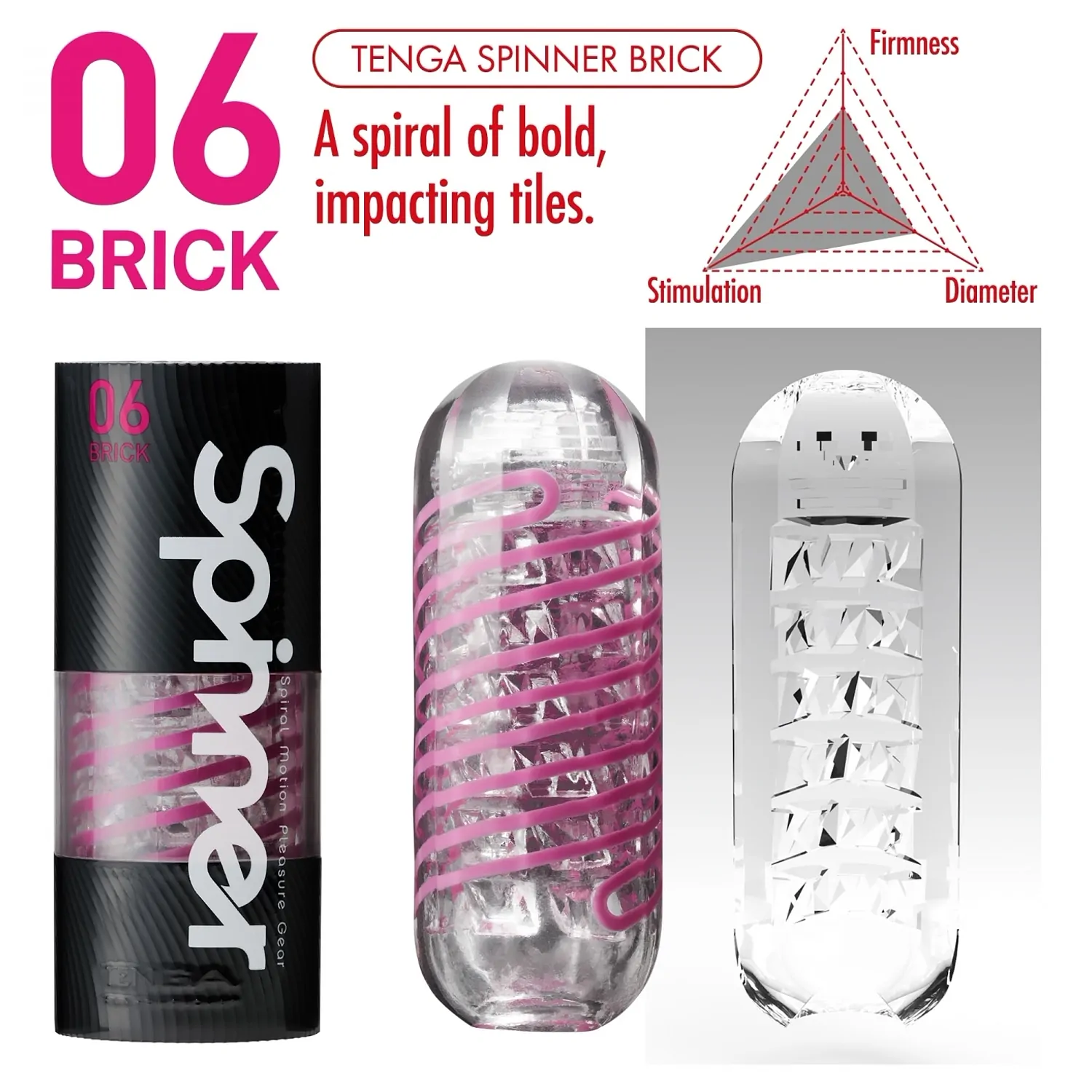 -Extinderea și contracția părților spirale compune o răsucire puternică în funcție de cursă. -O bobină internă complet nouă face ca rotitorul să se răsucească în timp ce introduceți, trimițând trăiri incredibile la fiecare lovitură -Vine cu fermitate materială diferită pentru a se potrivi experienței, cel mai bine să o utilizați cu loțiune tenga -Este un masturbator reutilizabil ușor de curățat și depozitat -Datorită designului său ușor, îl puteți scoate cu dvs. oriunde și peste tot. -Cu o utilizare corectă, puteți utiliza acest obiect aprox. De 50 de ori (variază în funcție de metoda pe care o folosești) -Elasticitatea îi îngăduie să ajungă la o mărime internă de până la 17 cm - Tenga Spinner Brick are striații interioare care imită efectul unui sex oral delicios. - Fiecare TENGA SPINNER include un plic tester de HOLE LOTION REAL de la TENGA. - Masturbatorul este rezistent la apă, fiind ușor de întreținut. - Conține o carcasă pentru uscare după curățare.