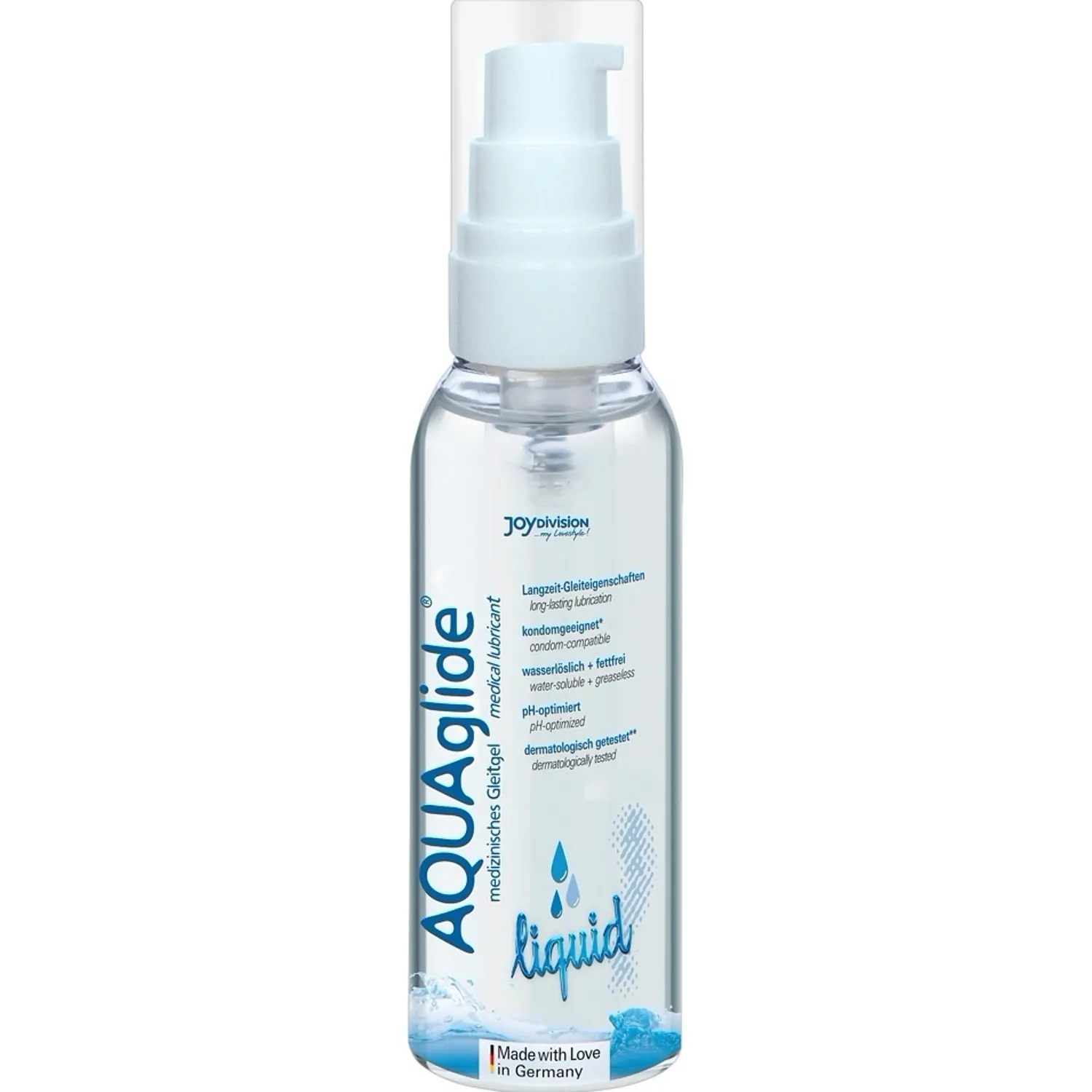 Lichidul AQUAglide este pe bază de apă, sensibil, plăcut și foarte prietenos cu pielea. Gelul limpede ca cristalul este optimizat pentru pH-ul pielii și păstrează echilibrul sensibil al zonei intime. Lubrifiantul lichid AQUAglide poate fi utilizat cu prezervativele din cauciuc și este potrivit pentru orice tip de jucărie sexuală.