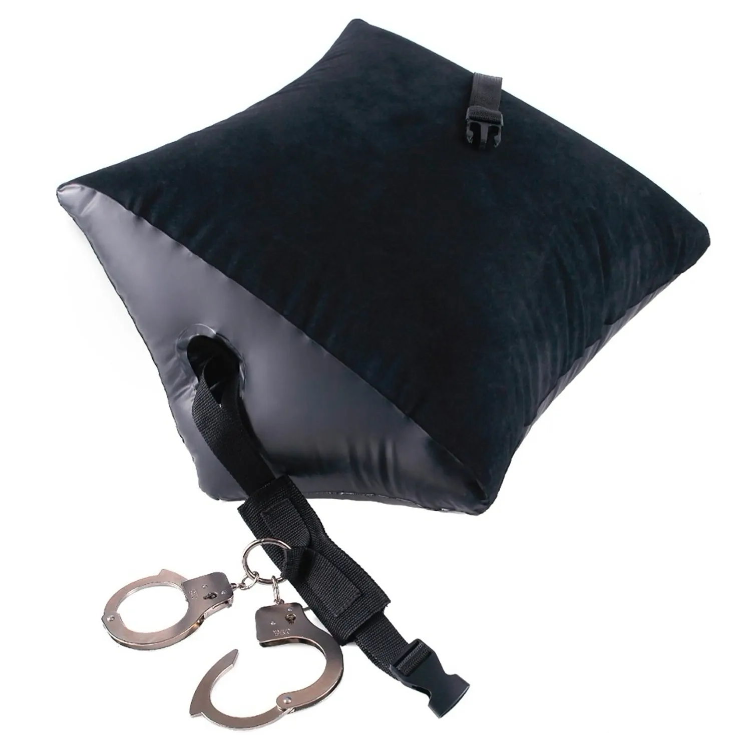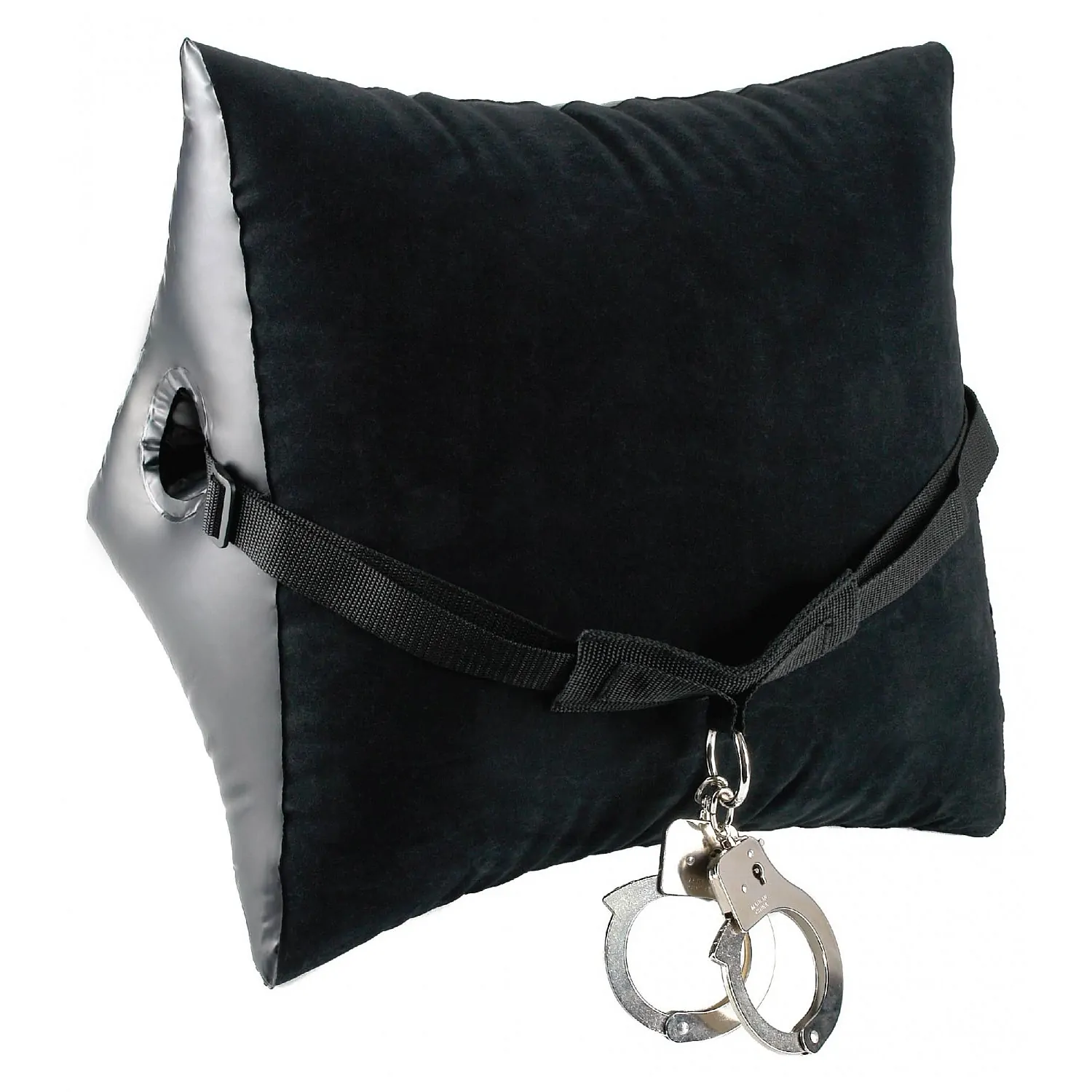 Lasă-ți imaginația să te ducă dincolo de limitele tale fizice cu incredibilul Deluxe Position Master cu Manșete. Această pernă de poziție dilatabilă are un centru gol conceput pentru a ancora o cingătoare extra puternică, care apoi se conectează la o pereche de manșete metalice. Odată ce partenera de așează peste pernă în formă de pană și este încătușată, aceasta nu poate să se miște sau să scape. Pernă umflabilă va îngăduie să explorați și să vă bucurați de poziții noi pe care nu le-ați crezut niciodată posibile, în timp ce soțul dvs. este comod reținut! Vinilul cu catifea jelly și mătăsoasă se simte excelent pe pielea ta. Introduceți cureaua prin poziția Master în timp ce este dezumflată, apoi umflați panoul și reglați cureaua pentru a se potrivi divin în jurul partenerului. Cureaua groasă din nailon are o clemă din plastic și o cataramă pentru a împiedica masculul să scape, iar manșetele metalice au pârghii cu eliberare rapidă, doar în cazul în care pierdeți cheile. Supapa de etanșare a aerului face ca umflarea pernei să fie rapidă și, atunci când distracția s-a terminat, pur și simplu o dezumflați. Este ireproșabilă pentru acele escapade romantice!