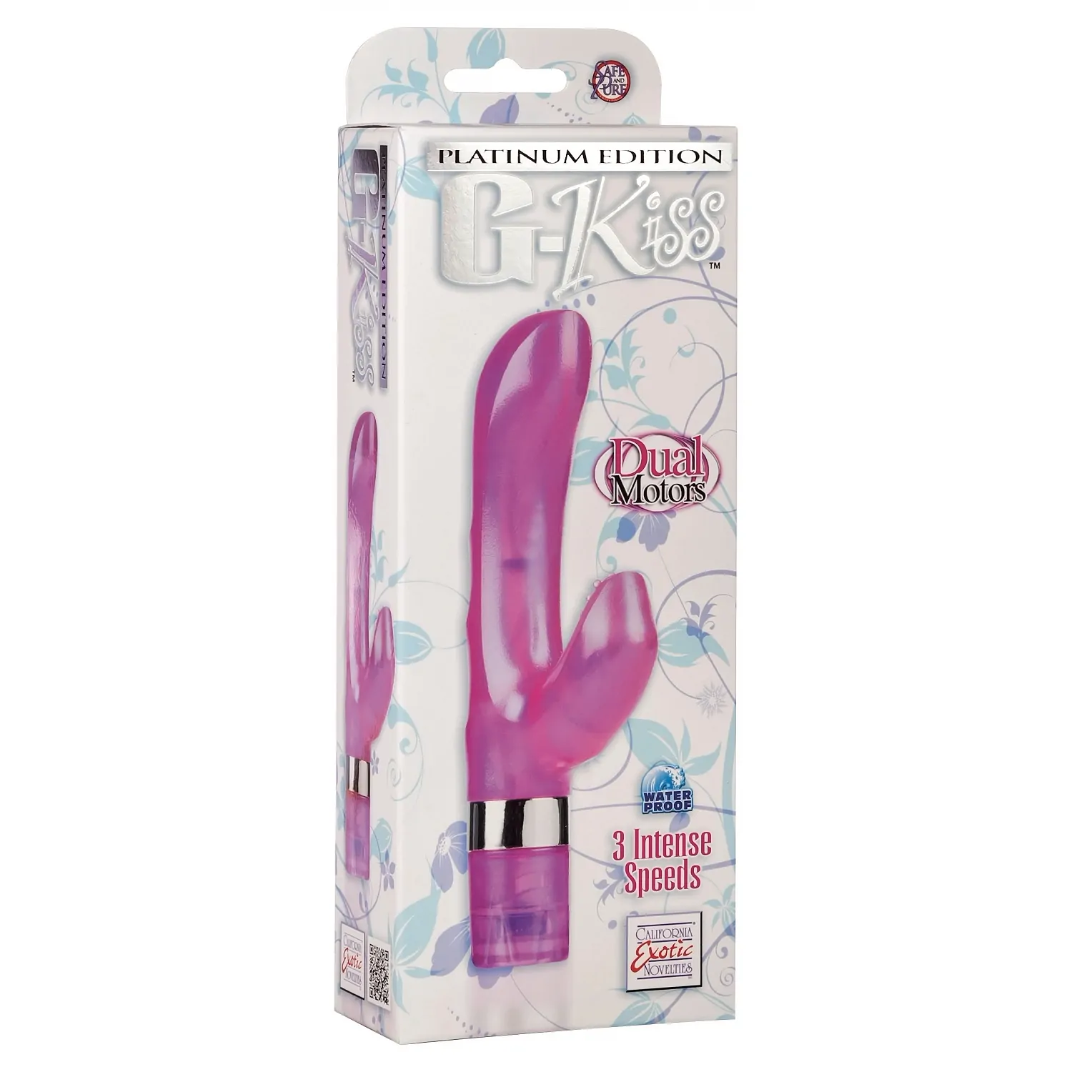 Vibratorul G-Kiss profilat și compact este realizat pentru a oferi plăcere intimă maximă. Stimulatorul combinat se mândrește cu două motoare, 3 viteze intense de vibrație, un vârf curbat pentru punctul G și un teaser pentru clitoris. Este făcut dintr-un material extrem neted și flexibil. Vibe-ul are un arbore conturat cu creste de plăcere, un vârf larg, unghiular pentru punctul G și un teaser curbat pentru clitoris, cu noduri flexibile, pentru o stimulare intensă. Motoarele duale alimentează 3 viteze ascendente puternice care sunt comandate cu ușurință prin intermediul capacului de la bază. Pentru a vă maximiza experiența de furnicături, întrebuințați întotdeauna un lubrifiant de calitate cu această jucărie. Stimulatorul este impermeabil și poate fi întrebuințat pentru a masa și a încânta toate zonele sensibile ale corpului, în interiorul sau în afara apei. Stimulatorul combinat este ideal pentru utilizatorii neexperimentați sau pentru exploratorii cu practică cărora le place să se delecteze cu jocurile sexuale solo.