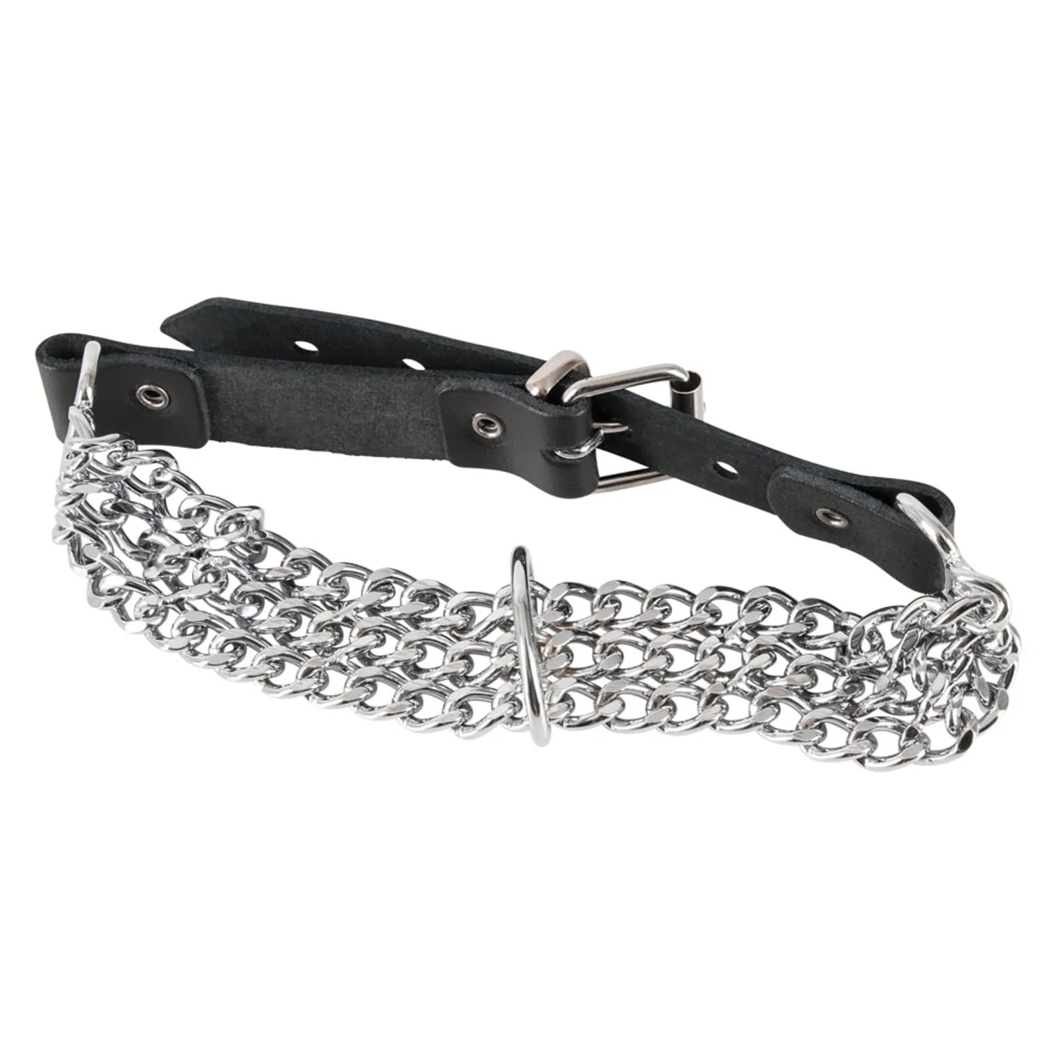 Guler pentru gât, întunecat cu trei lanțuri metalice la care se poate fixa o lesă. Închidere reglabilă cu cataramă.