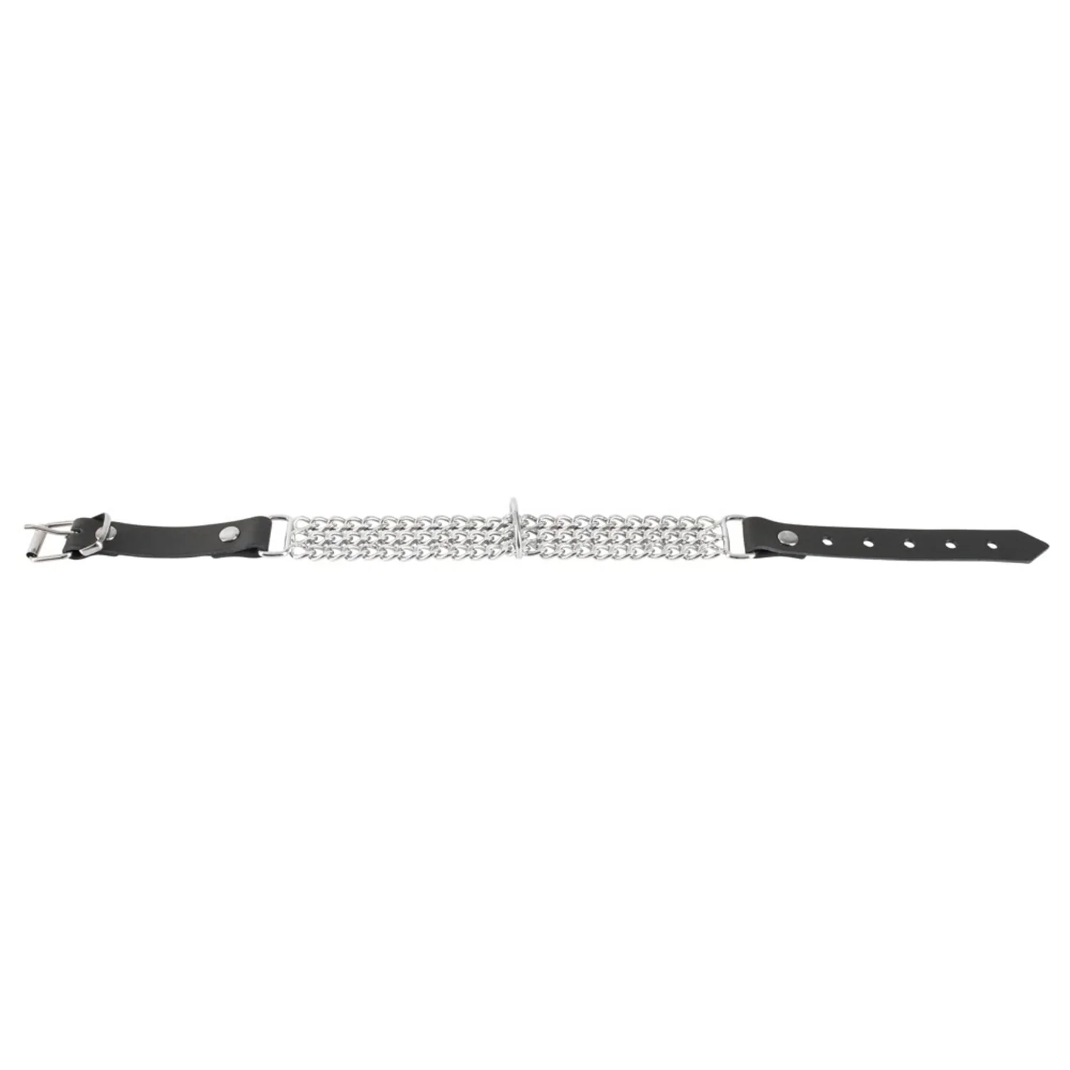 Guler pentru gât, negru cu trei lanțuri metalice la care se poate fixa o lesă. Închidere reglabilă cu cataramă.