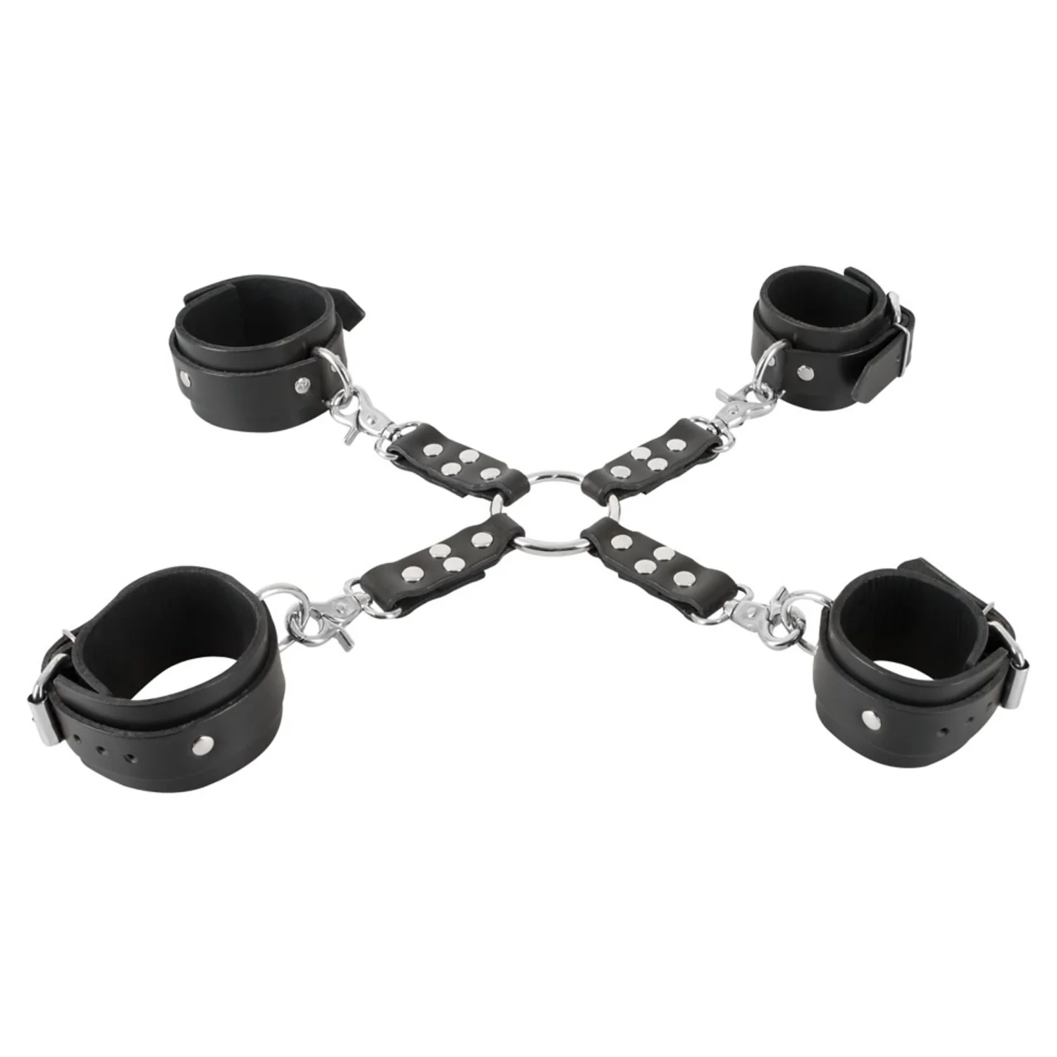 Set bondage pentru iubitorii de robie! Cătușele și manșetele gleznei sunt netede în partea interioară și sunt, de asemenea, decorate cu știfturi, la fel ca crucea de conectare inclusă.