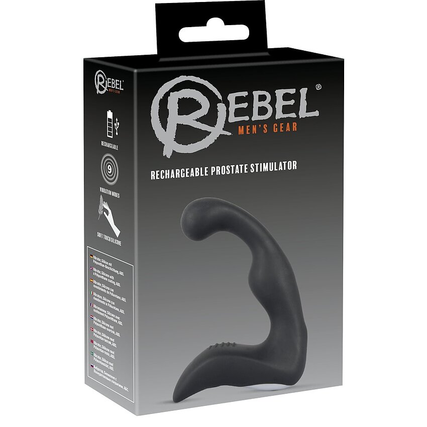 Masator pentru prostată flexibil, cu vârful curbat, axul ondulat și stimulator canelat pentru perineu. Masatorul Prostată Rebel are 9 moduri de vibrație, care pot fi controlate la apăsarea unui buton. Poate fi reîncărcat cu cablul USB inclus.
