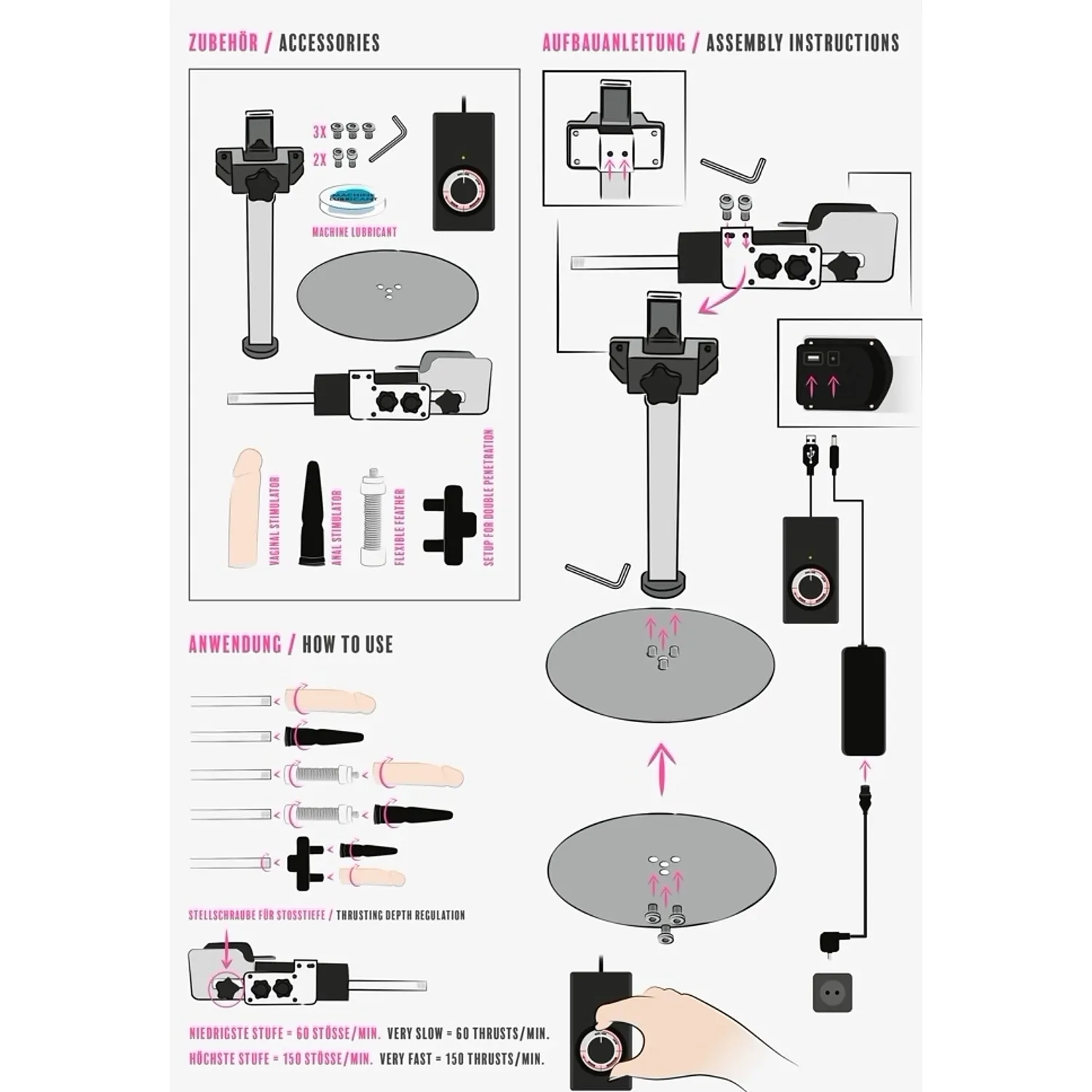 Distracție hands free, cu până la 150 de împingeri pe minut! Mașina sexuală cu un suport reglabil și două capete. Poate fi reglat prin telecomandă și se poate roti până la aproximativ 360 grade. Furnizează până la 150 de împingeri pe minut. Realizat pentru utilizare hands free și într-un design îngust și modern. Extindere cablu de 1,5 metri cu ștecher de rețea (ștecher Schuko tip F). Capăt pentru dublă inserție inclus. Stand cu lungime completă 42 cm, vibrator realist 18 cm, vibrator anal 16,5 cm.