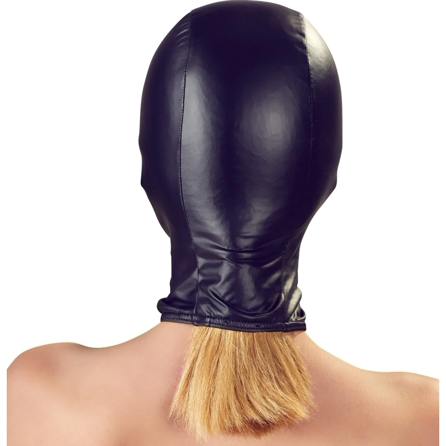 Punctul culminant la fiecare petrecere fetiș! Mască de cap extensibilă care se potrivește ca o a doua piele. Mască este neagră, cu excepția materialului de deasupra feței care este vișiniu. Cu găuri negre mari în jurul ochilor și gurii. Se află perforații pentru nări.