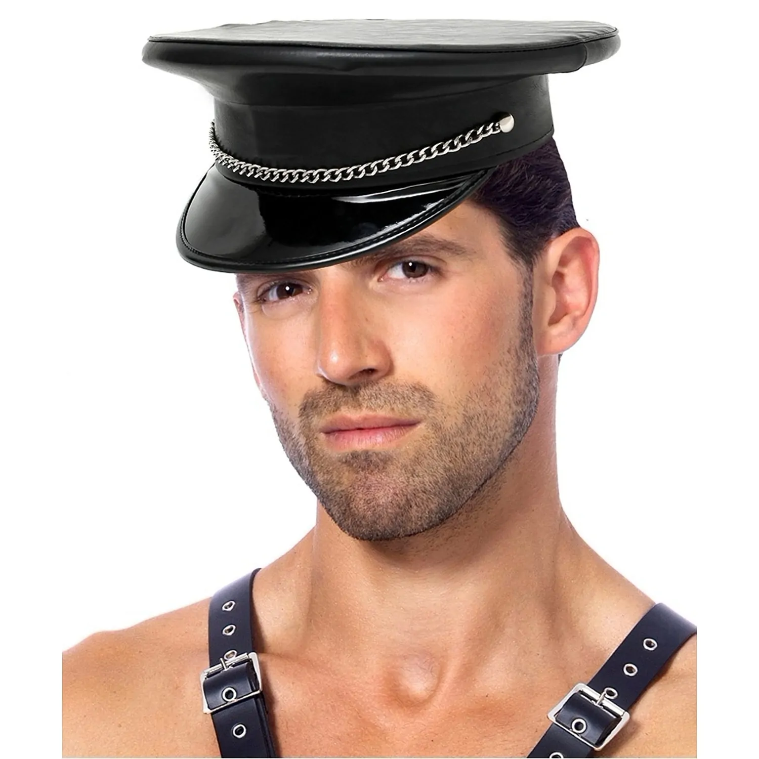 Rimba Bondage Play pălărie de poliție perversă cu lanț metalic în față. Această pălărie este fabricată din imitație de piele sintetică.