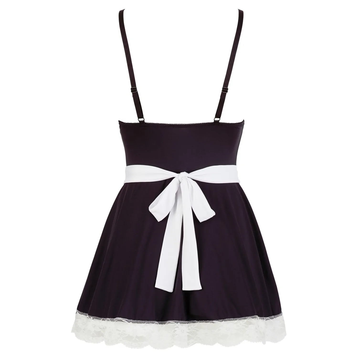 - Costumul include o rochie cu bretele ajustabile și o fustă ușor evazată, care flatează silueta. - Rochia are dantelă albă la tiv și în zona decolteului. - Kitul include un șorț care poate fi legat și are dantelă și fundițe decorative.